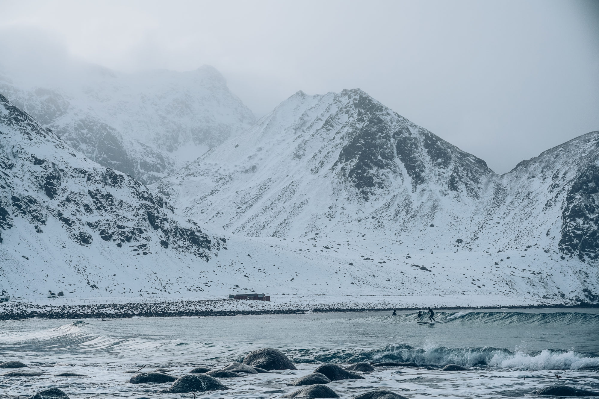 Att surfa en våg samtidigt som snön faller, omgiven av branta snötäckta berg var sannerligen en upplevelse jag sent kommer att glömma.