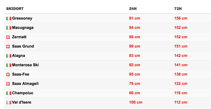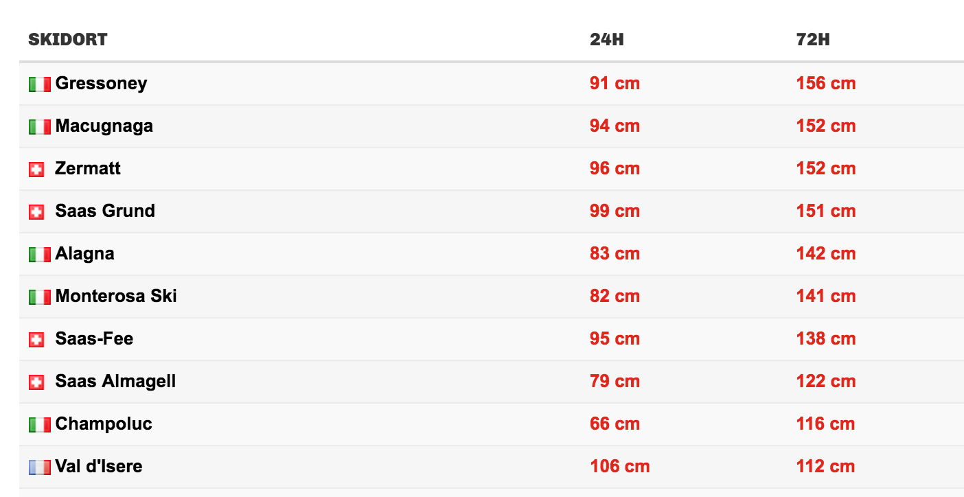 Nere i Alperna har säsongen också bjudit på mycket snö. Vi har tidigare rapporterat både om en strålande säsongsupptakt i Verbier i Schweiz och även tokdump i franska Alperna. Detta är dock en månad gammalt nu och när vi kikar på de kommande tre dygnen verkar skidorterna kring Matterhorn och Monterosa på den italienska sidan vara de stora snövinnarna. Gressoney, som tillsammans med Alagna och Champoluc ingår i Monterosa Ski, förväntas få nära 1,6 meter snö de kommande tre dygnen. Zermatt spås också strax över halvmetern snö måndag – onsdag.
