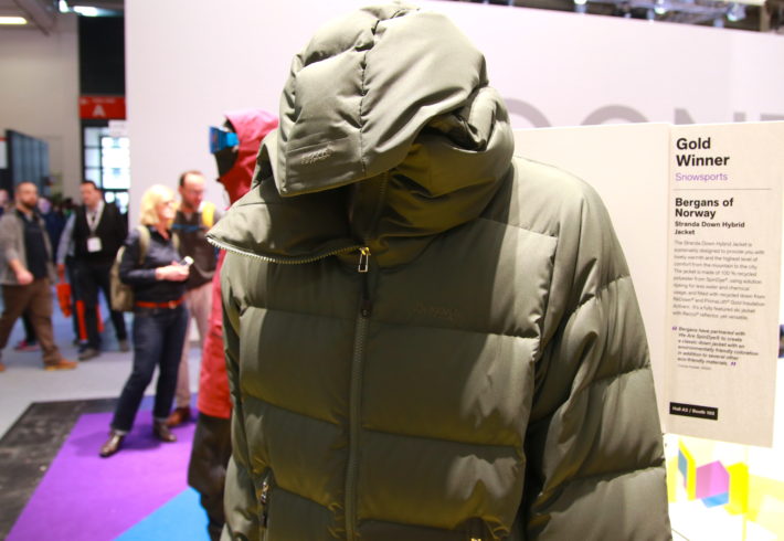 Även norska Bergans kan göra dunjackor som får ISPO-juryn på fall. Stranda Down Hybrid Jacket är tillverkad i hundra procent återvunnen polyester, samtidigt som infärgningsmetod som kräver mindre tillsatser och vatten. Både det dun och PrimaLoft som har använts är återvunnet. Att den också är en riktig skidjacka med alla tänkbara features och RECCO-reflektor var det som slutligen fick ISPO-juryn att dela ut guldpriset till klädtillverkarna i Hokksund söder om Oslo.