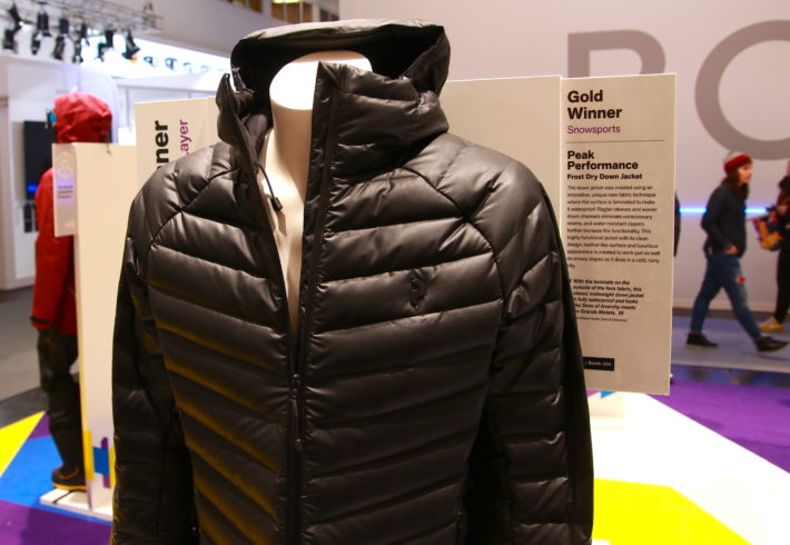 Svenska Peak Performance tycker inte att dunjacka ska stanna i garderoben bara för att himlen gråter en skvätt. Med en ny teknik har Peak Performance laminerat yttertyget och fått det vattentätt. Dunkanalerna i jackan är också vävda istället för sydda, vilket har gjort att yttertyget inte behöver få håll som kan läcka vatten och/eller dun. Vattentäta dragkedjor, en lite lyxig och läderlik look var de sista två pusselbitarna som fick ISPO-juryn att bli knäsvag.