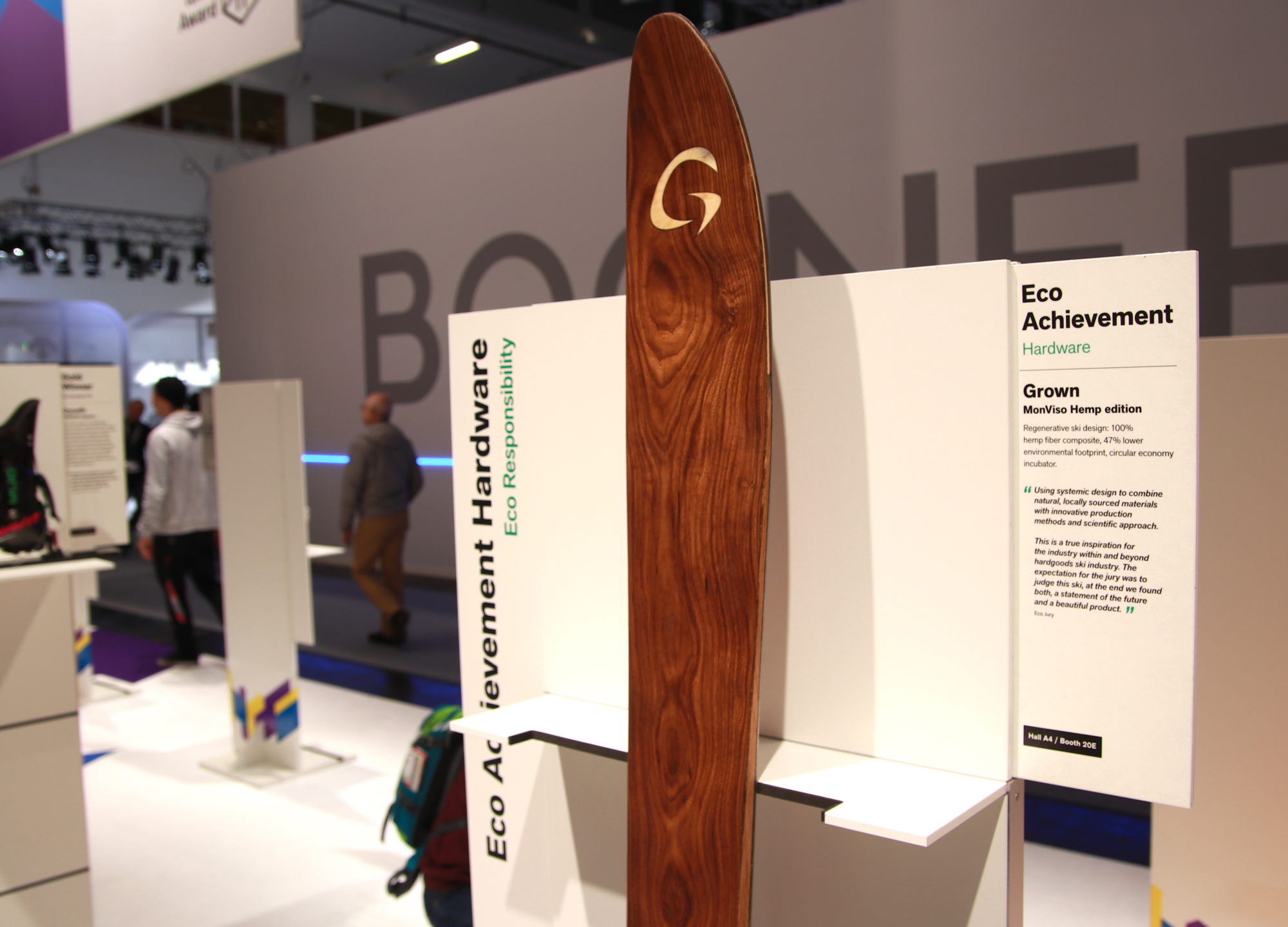 En träig skida på utsidan som är gjord helt av hampa-komposit. Även en skida som gett hälften av det normala miljöavtrycket som traditionella skidor görs. Juryn höjde Grown:s skidmodell MonViso Hemp edition till skyarna med citatet ”a statement of the future, and a beautiful product”.