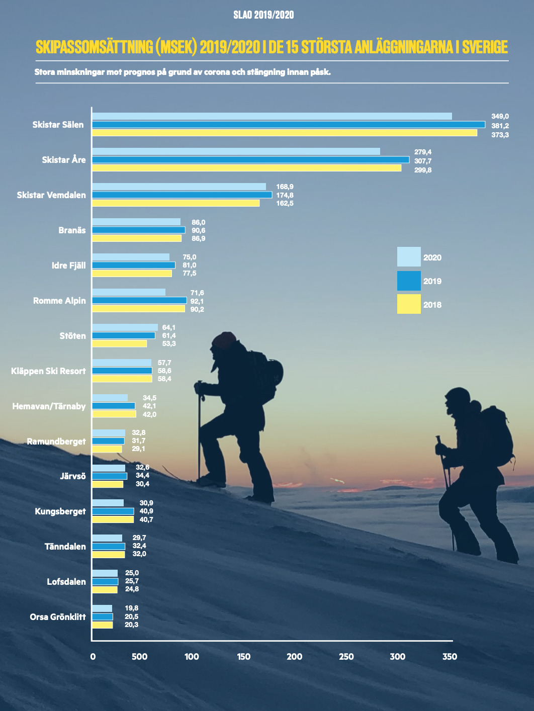 De svenska skidanläggningarna sålde skipass för 1,5 miljarder kronor exklusive moms under vintersäsongen 2019/2020. Det var en minskning med 13 procent jämfört med föregående säsong, som var ett rekordår. Prognosen inför säsongen visade på en ökning till över 1,8 miljarder kronor.