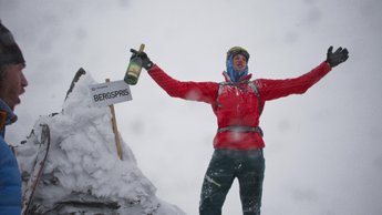 Bergspris till en bergsget.Än är vi inte uppe och vinden piskar på bra och man kan ana vilken påfrestning Mattias Skantz har utsatt sin kropp och psyke för. När han besteg Tysklands högsta topp Zugspitze (2962 möh) var det 29 minusgrader och hård vind. Men det är egentligen inte toppen i sig som är målet.