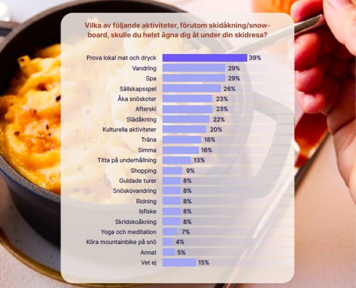Totalt ligger afterski på en sjätteplats på listan över aktiviteter, förutom skidåkning, som svenskarna helst vill ägna sig åt under skidresan. Den kommer efter vandring och spa men slår både skridskoåkning och ridning med bred marginal.