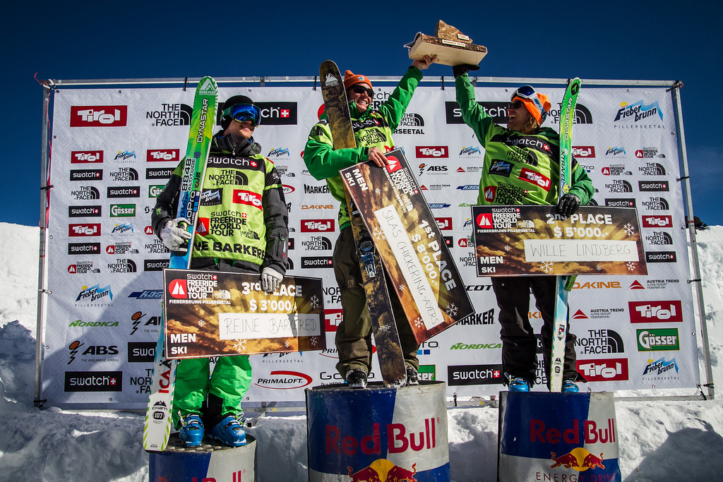 Reine Barkered och Wille Lindberg på pallen i Fieberbrunn under FWT 2013.