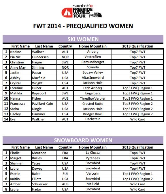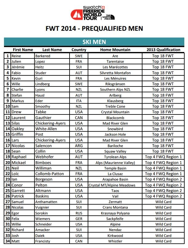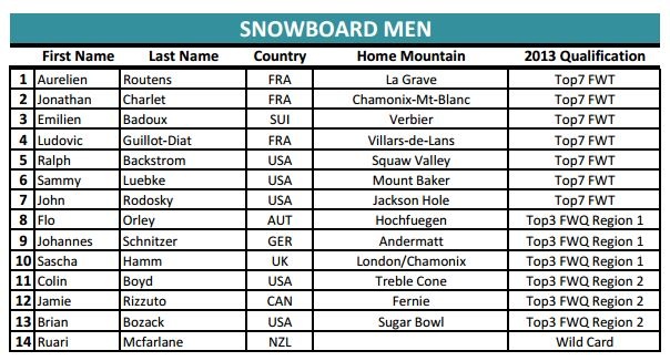 Större delen av starfältet, däribland samtliga svenskar, har i praktiken varit klara sedan FWT och FWQ avslutades i våras, men nu har även namnen på wildcarden släppts. En som kan bli klart spännande att följa är Nicolas Vuignier, en mångsidig ung schweizare som tävlade i JOI så sent som 2011 men tillbringar mer och mer tid ute i backcountryt. En annan intressant åkare är sverigebekantingen Neil Williman som är tillbaka på fintouren efter att ha varit skadad och kört kvaltour.