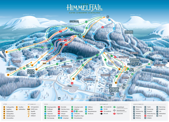 4 nya nedfarter, varav en tävlingsbacke uppkallad efter vår egna Frida Hansdotter, Frida Race Arena. Perfekt för träning och tävling.