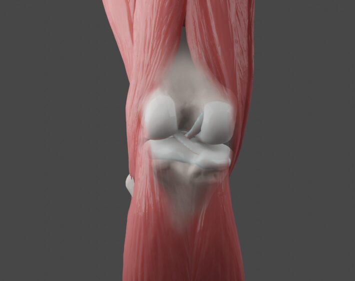 Låt oss börja med de två benen som förbinder knäleden – lårbenet (femur) och skenbenet (tibia). Lårbenet är försedd med en stor muskelgrupp (quadriceps), ofta kallad framsida lår i träningssammanhang, som går längs hela låret ned mot knät där den (enkelt förklarat) övergår till en sena som sitter fast på knäskålen och övergår sedan till patellaligamentet som i sin tur fäster i skenbenet, under knät.