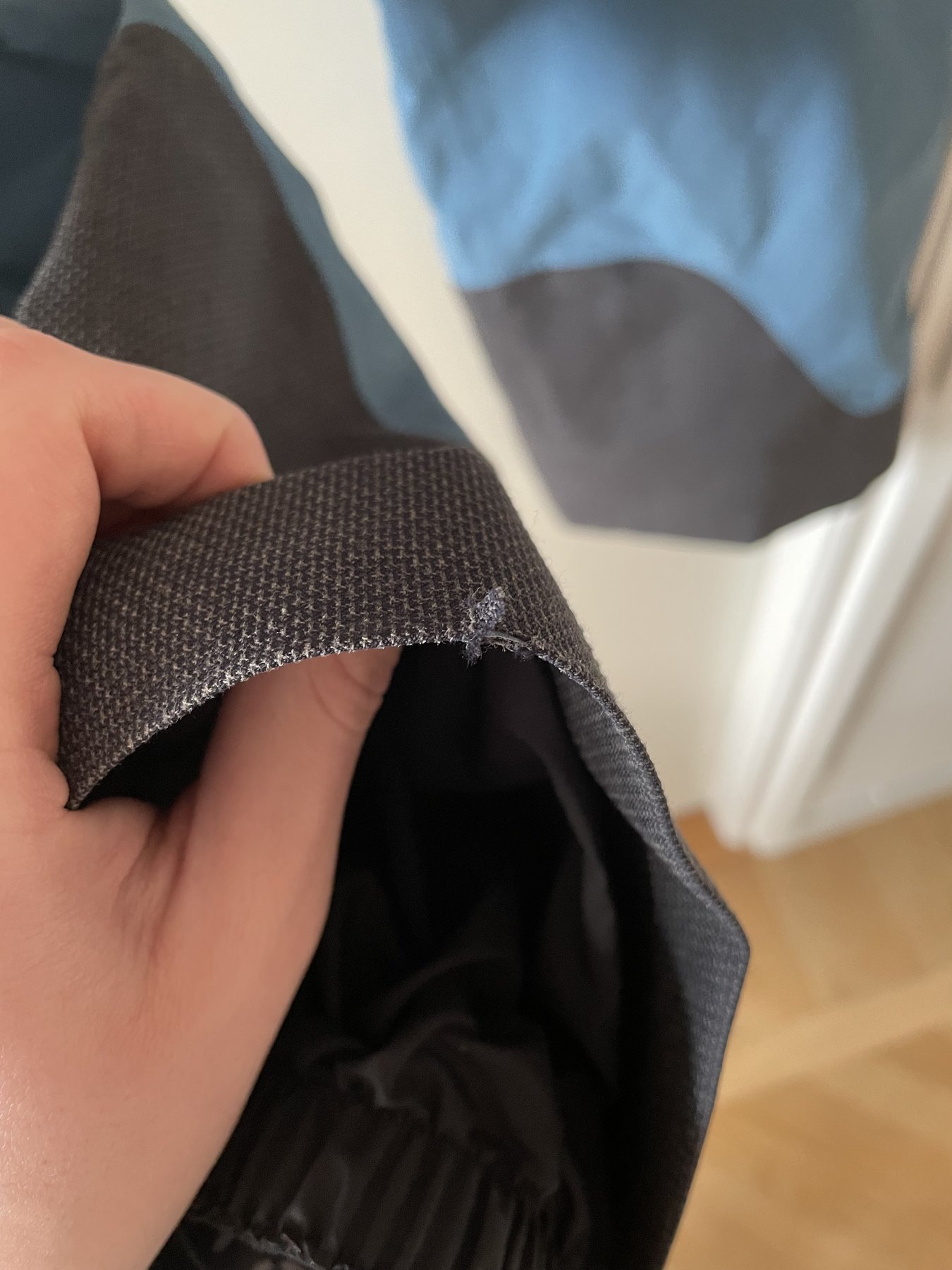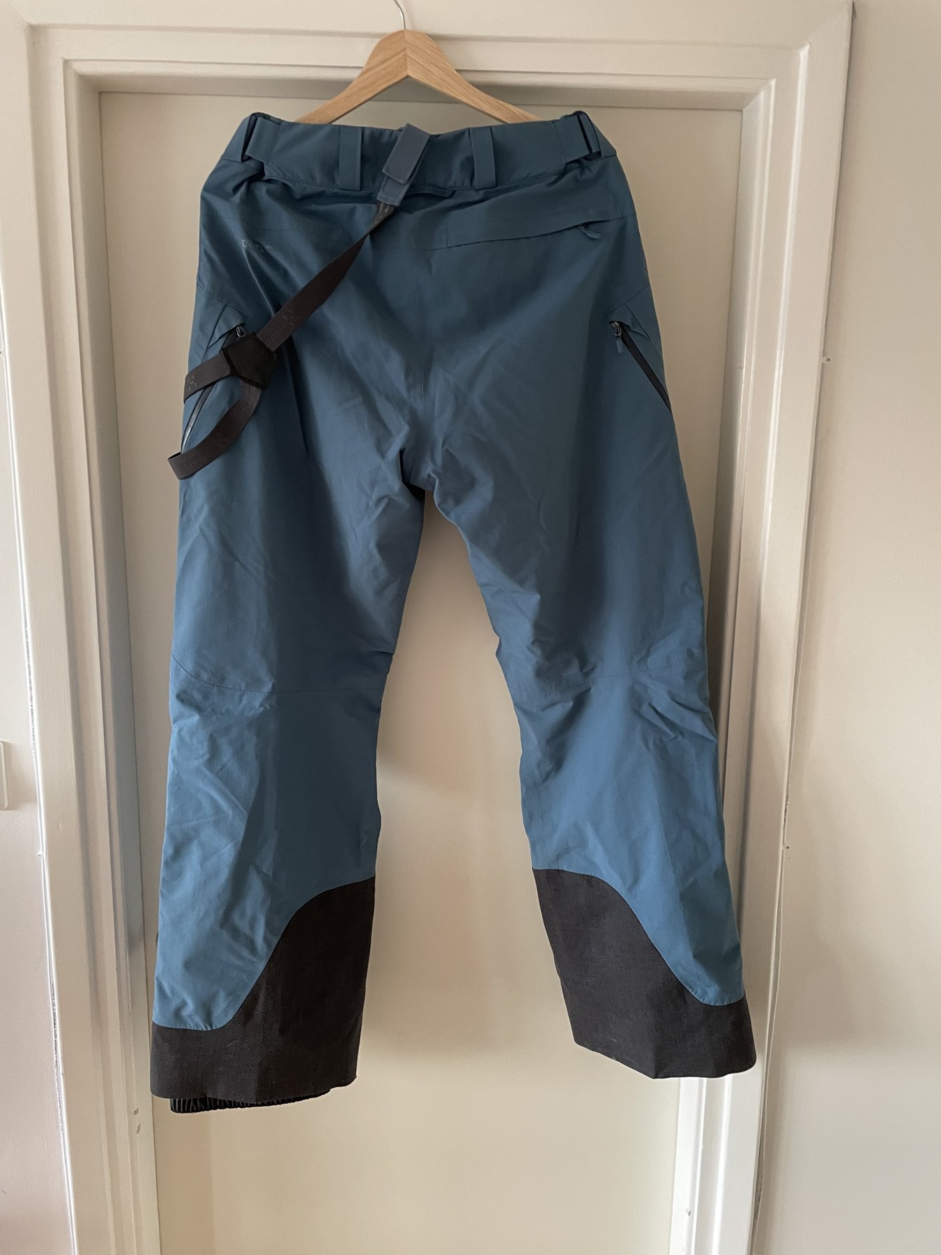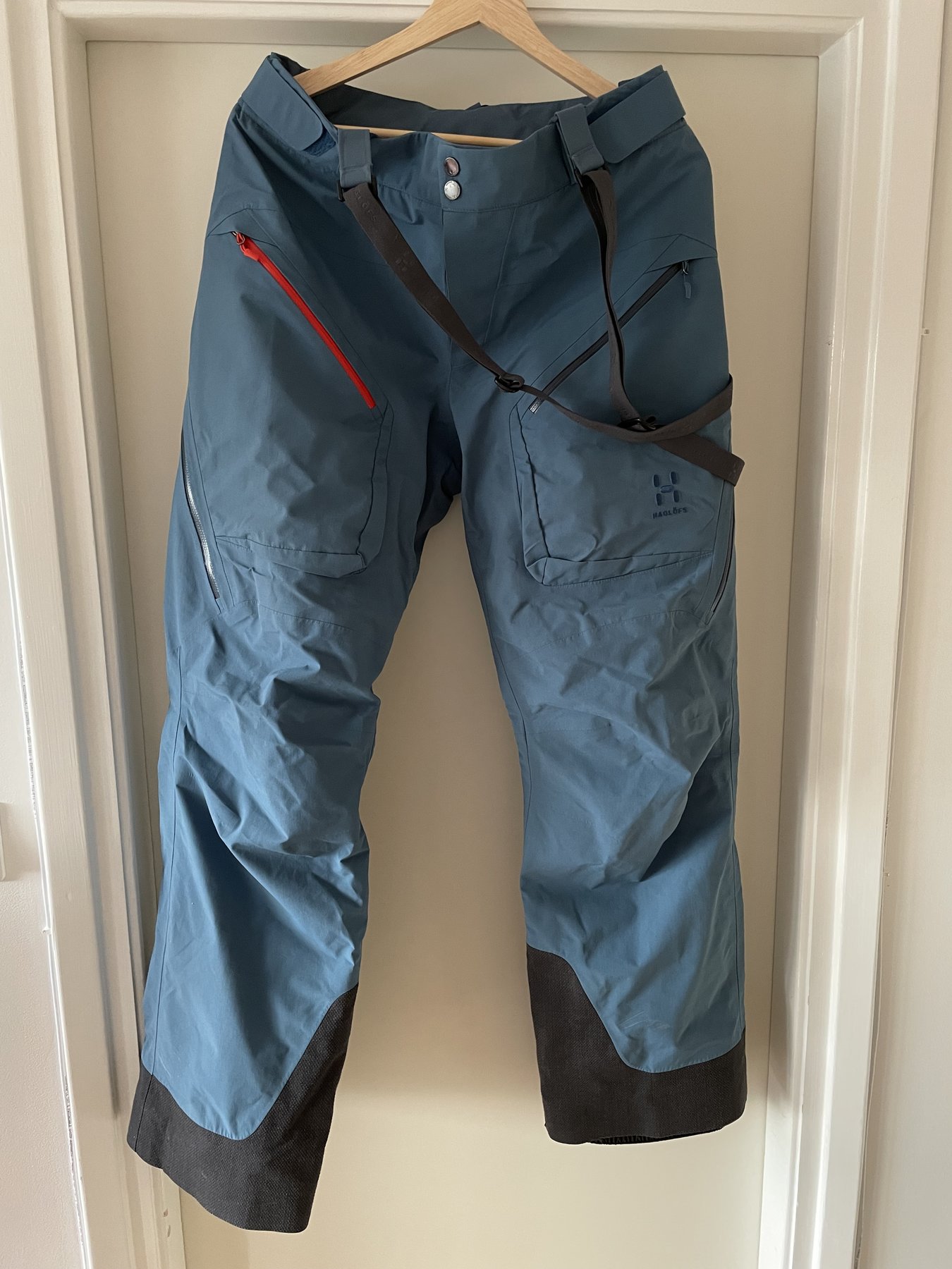 Skalbyxor Haglöfs Chute III, ljusblå, använda lite mer än jacka enda slitaget är att det rivits upp en jätteliten bit nere där pjäxorna sitter (se sista bilden). 1000;-