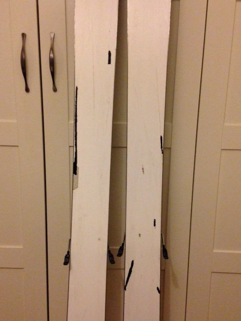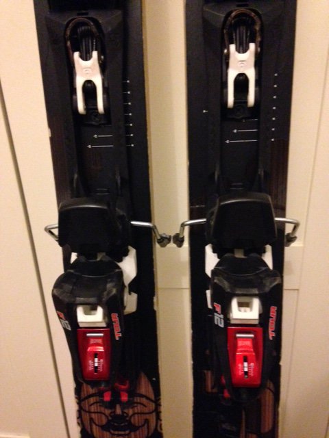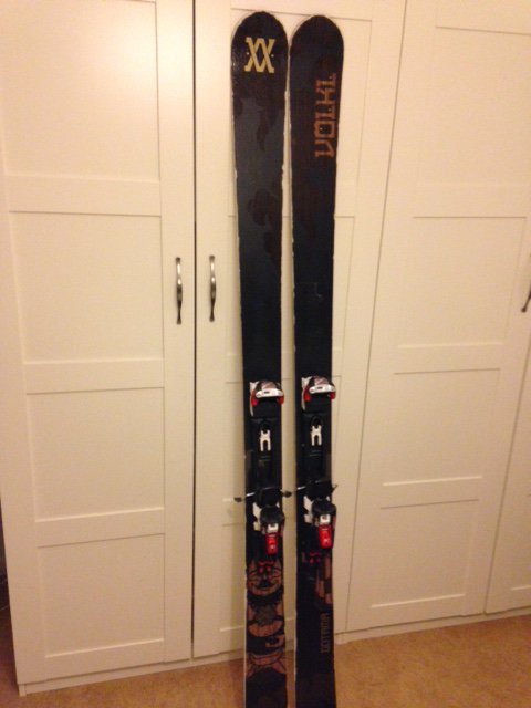 Ett par Völkel Gotama 185cm från 12/13 med en brädd på 10,5 under foten. Rocker hela vägen från bindningen fram o bak ger en grym åkning i Offpisten.