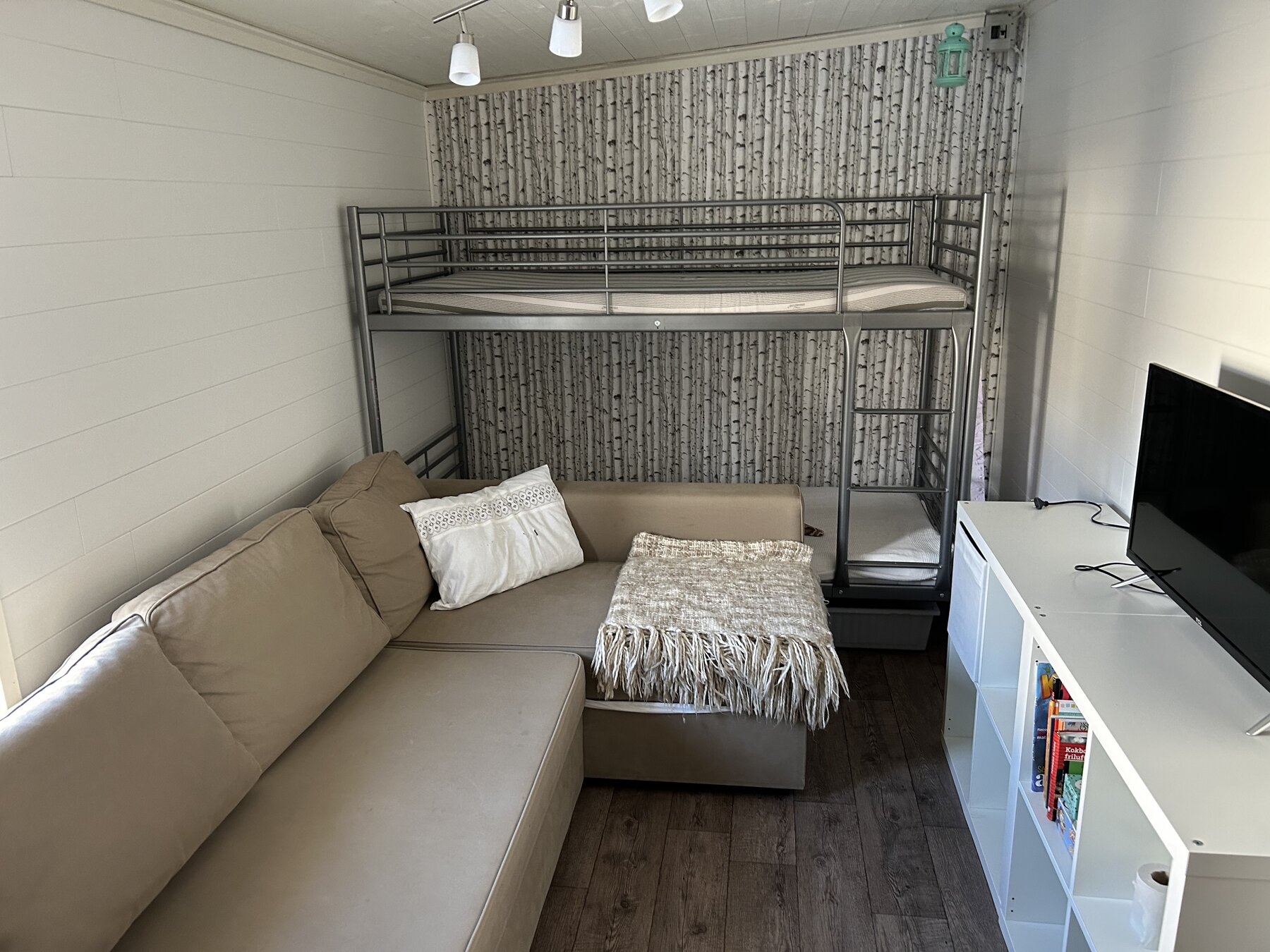 Stugan står på campingen i Trillevallen. Byggår 2019 och i fint skick, rymmer både våningssäng, bäddsoffa, tv och bra förvarings och upphängning. Går att flytta till annan plats.