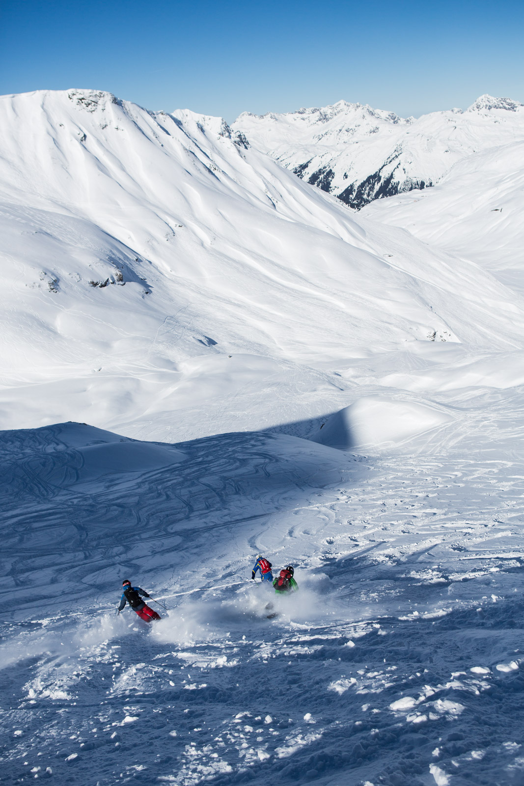 Valluga: Högre än till toppen Valluga 2 811 meter över havet kommer du inte i Arlberg med lift. För att få åka sista lilla blåa kabinen Vallugabahn II måste du vara i sällskap med guide (men det går också att gå den sista biten upp). Åk finns i flera varianter ned mot Zürs i norr. Valluga är inte högalpin terräng som exempelvis Chamonix Aiguille du Midi, men det är för den sakens skull inte fritt från risker – klippor och laviner är de mest påtagliga. Ha lokalkunskapen eller köp den (läs: hyr bergsguide).