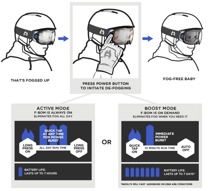 Dave McCulloch´s eventuella lösning är dock lika självklar som enkel vilket tänder ett litet tomtebloss av hopp om att detta faktiskt kan fungera. Än en gång är det elektronik som skall göra oss mer klarsynta i vintermörkret. Immiga goggles uppkommer som bekant när fukt i luften blir till vatten snabbare än det kan dunsta. Genom att leda ström genom en tunn film placerad på inre linsen värms den upp till en temperatur som direkt får imma att dunsta. Det fungerar alltså ganska precis som på bakrutan i bilar. Lithium-ionbatteriet (li-ion) som dessa kommer att vara bestyckade med laddas genom att stoppa in en micro-usbsladd i gogglen och andra delen i väggen.