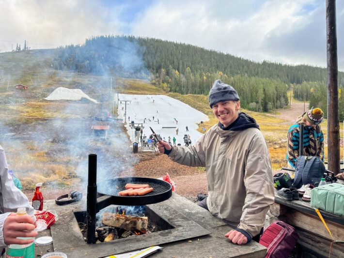 Längst nere vid liften finns en grillplats där vi grillade korv och delade skratt, minnen och förväntningar om den kommande säsongen. Musiken strömmade ur högtalarna och skapade en nästan högtidlig atmosfär som bara blev bättre när solen fortsatte att skina ner på oss, med undantag av en kort period av lätt duggregn.