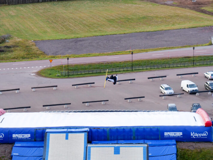 När klockan började närma sig stängning uppe i parkliften var Kläppen Arena med sin airbag nästa stopp. Denna omfattande arena med såväl airbag, trampoliner och railarena möjliggör förstklassig träning under hela våren, sommaren och hösten. Airbagen, som utgör navet av arenan erbjuder åkare att hoppa högt och landa mjukt för att kunna träna på nya trick innan vintern kommer och konsekvenserna av ett fall blir större. Något vi utnyttjade till fullo. Det blev två timmar av förtjusning, skratt och ett par snedsteg på den mjuka airbagen innan vi kollektivt begav oss ner mot parkeringen för att summera dagen och glida ur de blöta pjäxorna och ner i ett par torra strumpor och skor.