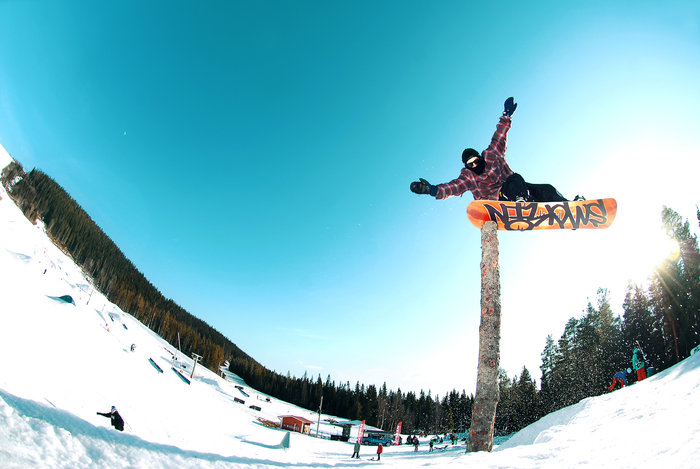 Det är nog egentligen några stycken som ligger rätt lika, men bilden ovanför på Markus Hjalmarsson när han tailtapar kan nog vara en av de som fått mest publicitet. Detta var under Snowboard SM i Kläppen och åkare från hela Sverige fanns på plats. Mycket intresse lades dock på själva ”tävlingsbanan”, trots att det fanns en hel del sådana här lite udda saker utsatta, vilket vi utnyttjade. Bilden har använts flitigt utav Markus brädsponsor från USA.