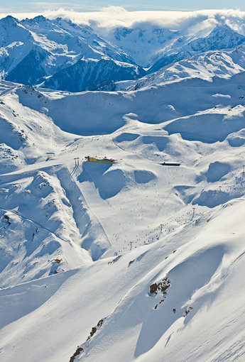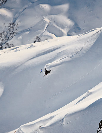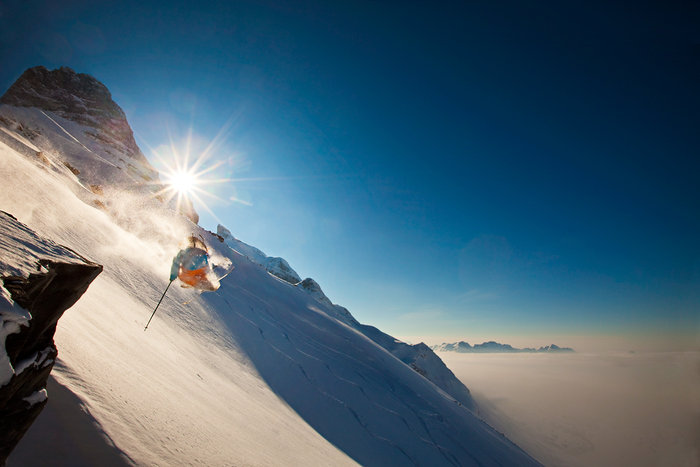 Lustig grej är att jag var och plåtade några dagar i Hochfugen för några år sedan med systrarna Hargin. Det året vann Janette Freeride World tour och även tävlingen i just Hochfugen. Hon blev bland annat hedrad med att få en egen gondol där nere med sin bild på. Så nu snurrar en åkbild från mig på Janette runt på en av de där gondolerna från just den platsen.