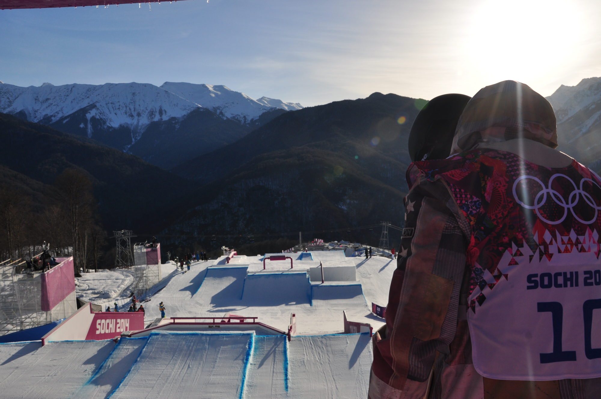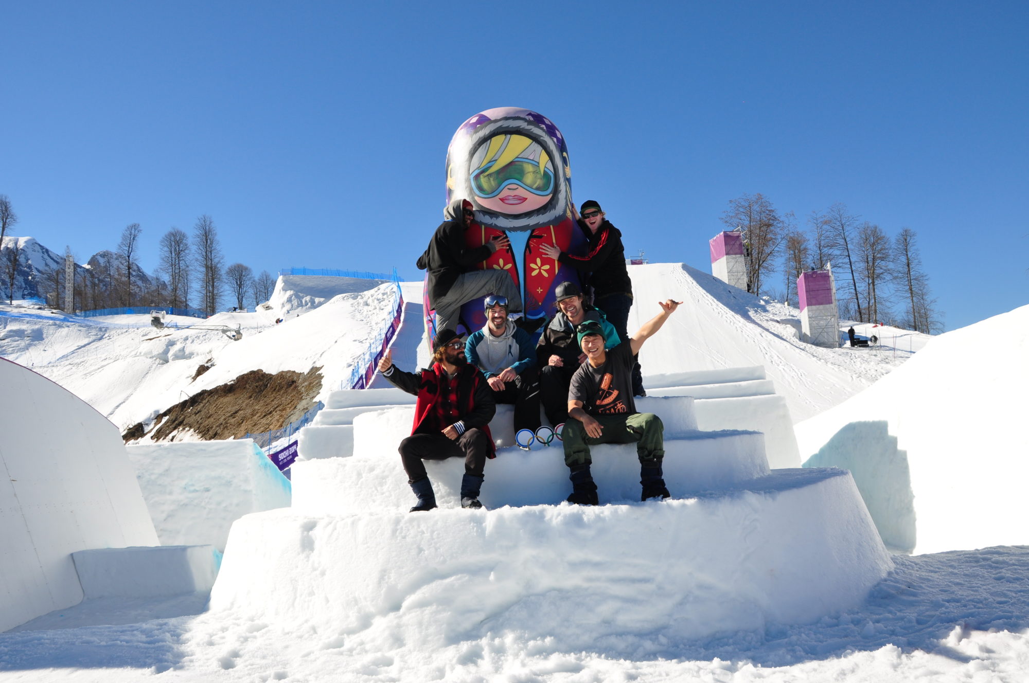 Branding är inte tillåten på ett OS. Och det var något vi inte hade tänkt på när vi skulle designa banan och framförallt jibsen. Vi fick inte använda oss av något som kan associeras till ett märke eller en produkt, inte heller något som kan anses vara politiskt eller stötande. Detta begränsade oss ganska rejält, ideer på vodkaflaskor, Gas trains, U-båtar, Pipelines, Balalajkas, rymdmonument osv fick strykas. Det var en hel process att få igenom Matryoshkan (dockan) som senare blev ett av OS mest fotade objekt. Likaså den andra jib-featuren var för lik en gasledningsstation (vilket var meningen), och fick göras om lite. OS ringarna blev inte heller tillåtet som feature att åka på och fick strykas. Då det är en stor kontors-/restaurangbyggnad precis bakom starten så var vi tvingade till en kort och snabb start. Första feature- stair set. Vi ville få in så många combos som möjligt. Andra feature – vi ville ha en utdragen feature som länkade ihop 1:a och 3:e för att undvika att åkarna bara åkte och speed checkade mellan features, det skulle se intensivt ut på TV. Tredje feature – ville ha en clean feature där åkarna kan få kontrollerad fart in till hopp sektionen.