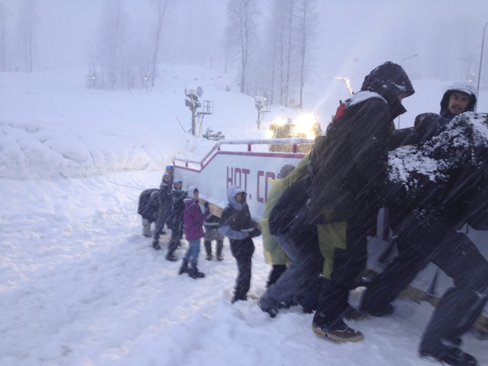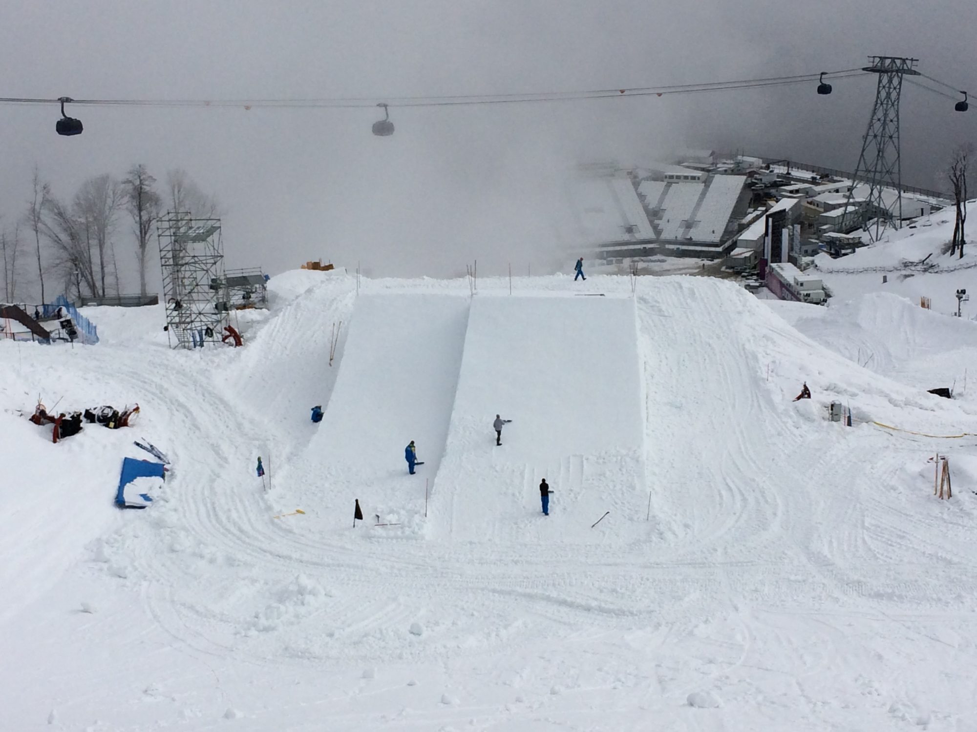 Under hösten 2013 tryckte vi på för att få ta in offerter från 5 erkända railföretag i Europa som skulle få tillverka railsen för slopestylen. Detta gick inte Ryssarna med på så railsen byggdes i Moskva och fraktades till Sochi. Vi fick också kritik för kvalitén på railsen av åkarna och en del rails blev vi tvungna att laga under tävlingen. Anlände till Sochi 5:e januari. Bra med snö och beordrade full snöproduktion för att vara på säkra sidan. Första veckan var det kallt och det snöade. Sen började värmen komma, först några dagar med varmt väder sedan började det regna. Det regnade konstant i 7 dygn non stop, vilket gjorde snön så blöt att vi började ha svårt att ta oss fram med maskinerna. Vi fick till och med bygga rail sektionen med vinsch. Byggjobbarna som skulle bygga ställningen till start plattformen gick helt plötsligt i strejk i en vecka för de inte fått betalt, så där stod vi utan start och kunde inte matcha in och bygga klart den översta delen på banan. En stor hjälp då snön var så blöt var att alla rails flögs upp med helikopter. Då vi inte hade någon maskin med kran eller någon grävare så fick vi flytta alla rails för hand med hjälp av volontärer. Då de flesta railsen var över 10m och vägde upp till 850kg så blev det rätt omständigt. När vi var i den byggfasen och vi inte kunde se någon förbättring i väderprognoserna fick vi bygga allt oversized och försöka kalkylera med hur mycket det skulle smälta och hur mycket