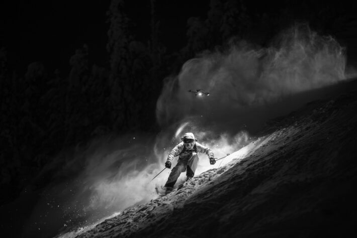 – Det handlar mycket om kommunikation och vad man är ute efter innan filmningen börjar så alla är på samma bana. Det är många beslut som behöver tas i stunden eftersom det kan vara väldigt oförutsägbart ute på fältet, speciellt när man använder FPV drönare och försöker följa en oberäknelig skidåkare i komplett mörker haha, säger Jens.
