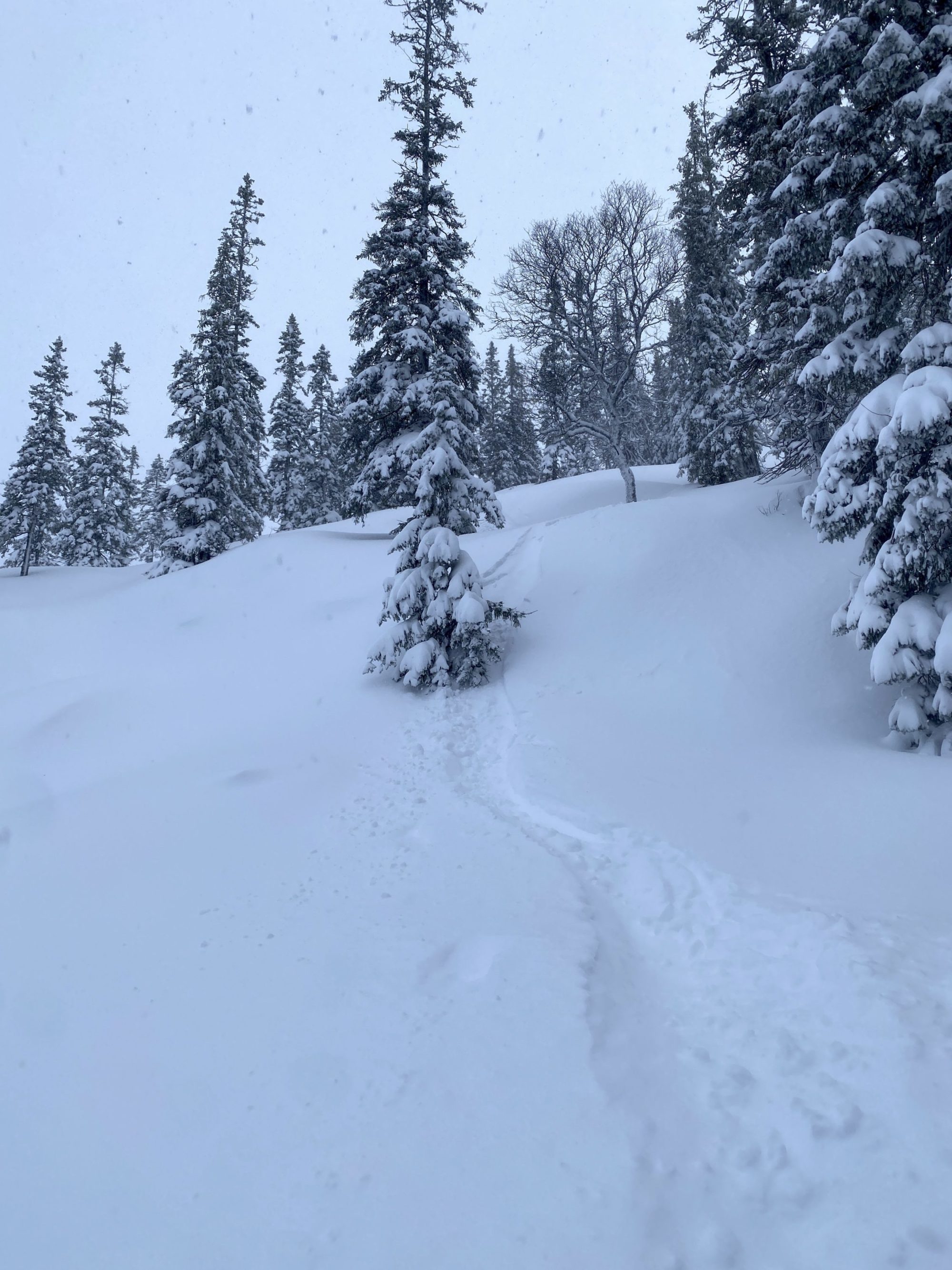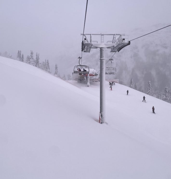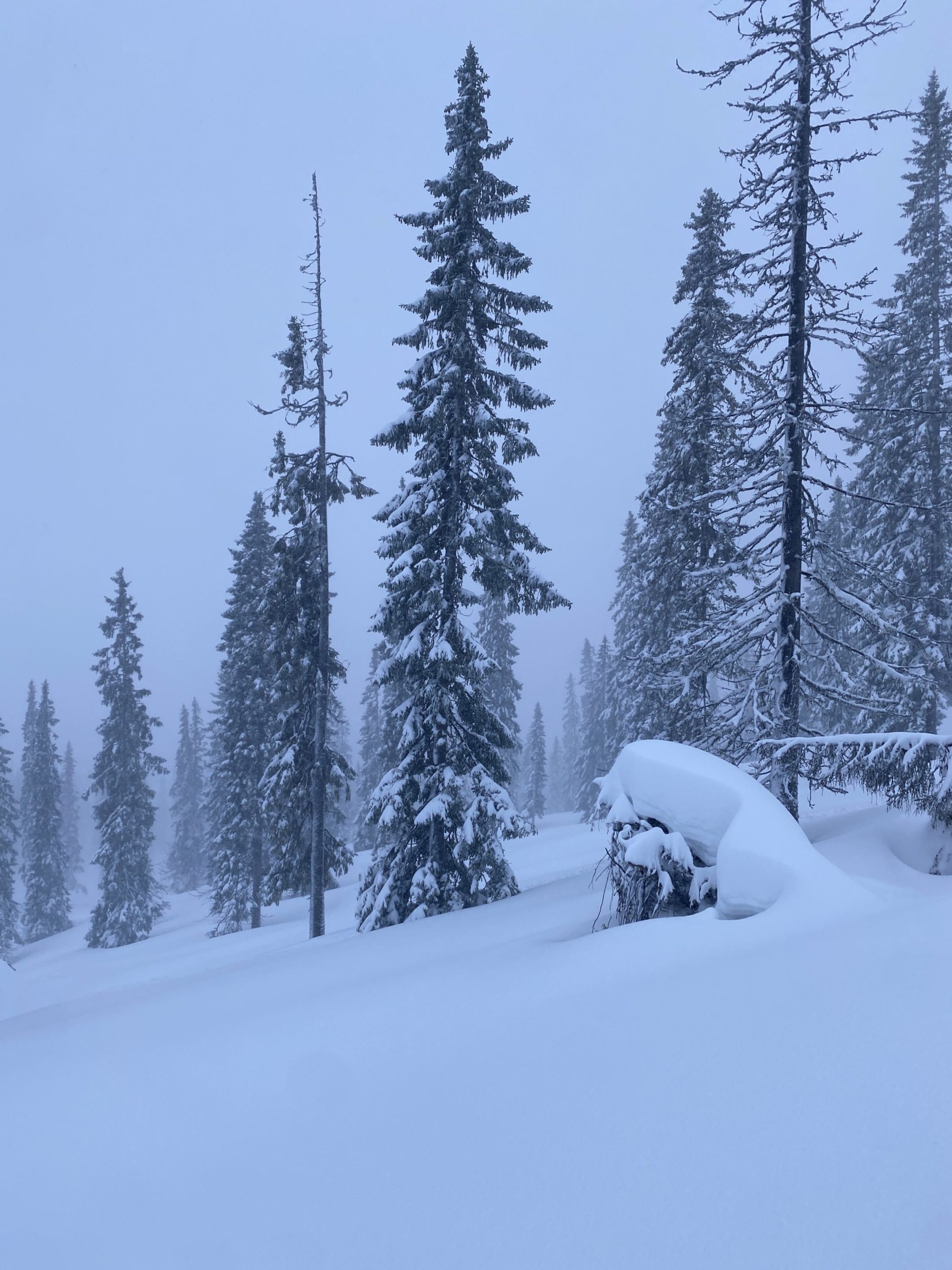 – Stora mängder snö har fallit och ju högre upp ju bättre. Vi hängde på låset vid VM6:an och fick några riktigt fina åk där det bästa helt klart var att köra hela Slalombacken ner opistad, var riktigt fin snö där. Snön är betydligt lättare högre upp på berget. Vi hann även med två turer i Tegefjäll, där var det väldigt fin snö och snöfallet fortsatte ordentligt medan vi turade.