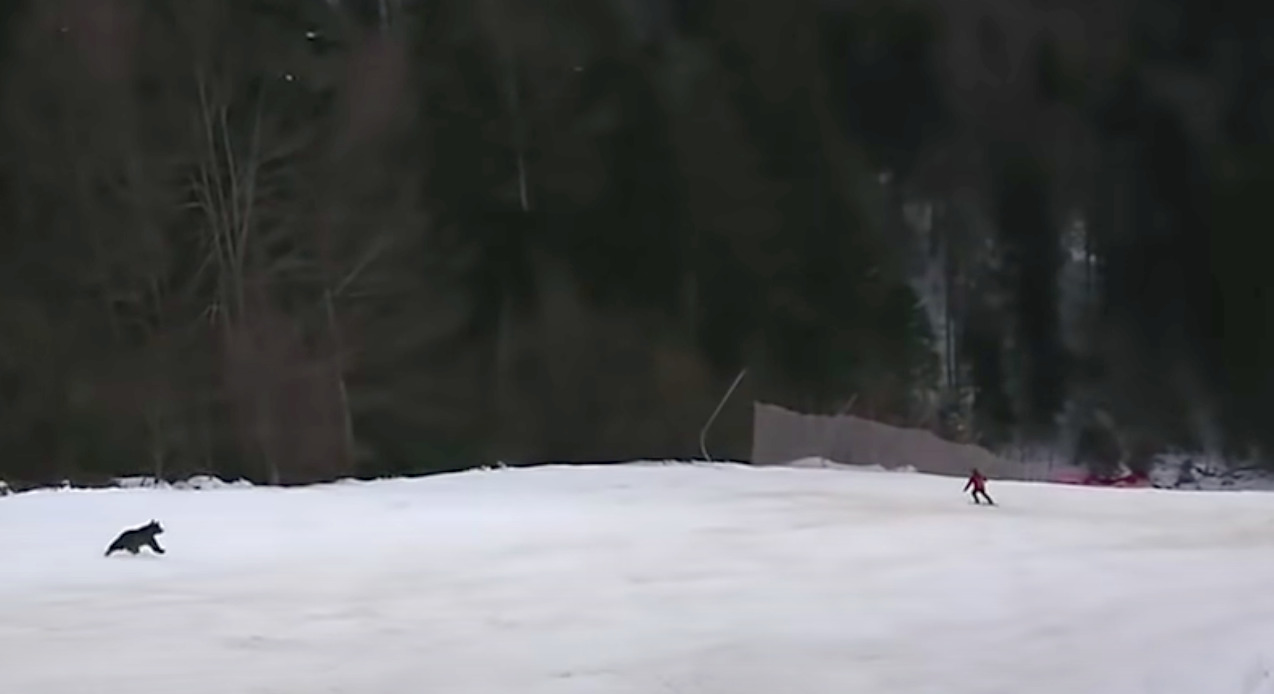 I den rumänska skidorten Predeal finns det fler risker än laviner och att bli påkörd av andra skidåkare. Tämligen chockerande bilder visar hur en brunbjörn i full kareta jagade en skidåkare nedför preparerade backe.