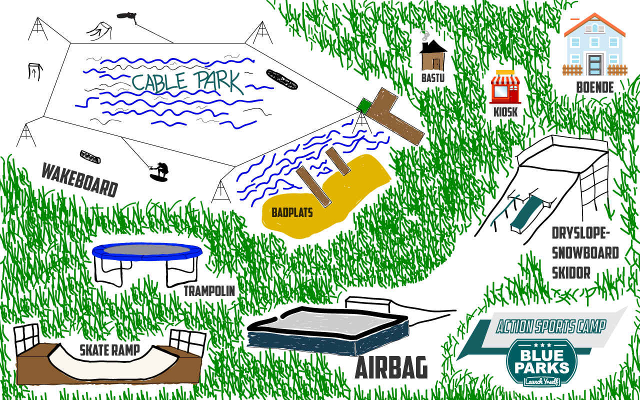 Aktiviteter: Dryslope railpark för snowboard och skidor, dryslope hopp ramp till BigAirbag, wakeboard cablepark, trampoliner, skateramp, gruppaktiviteter och utmaningar.