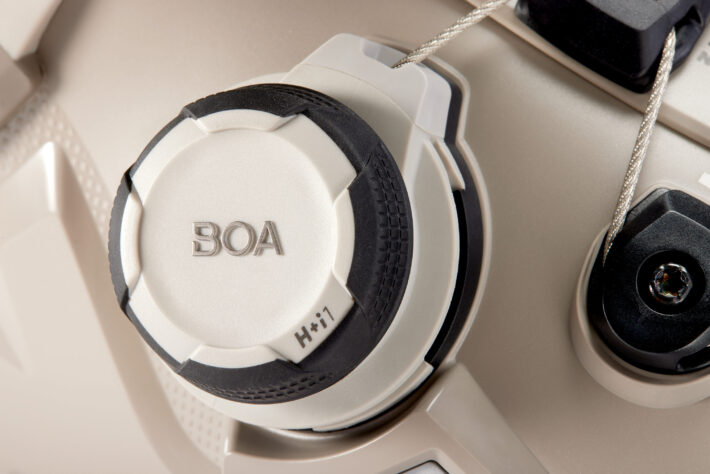 Systemet som används heter H+i1 och är ett superstarkt BOA-system som består av en cirkelformad ratt som går att vrida åt båda hållen får att spänna respektive lossa spännet till önskad passform. För att lossa spännet helt drar du ratten uppåt och aktiverar den igen genom att trycka in den.