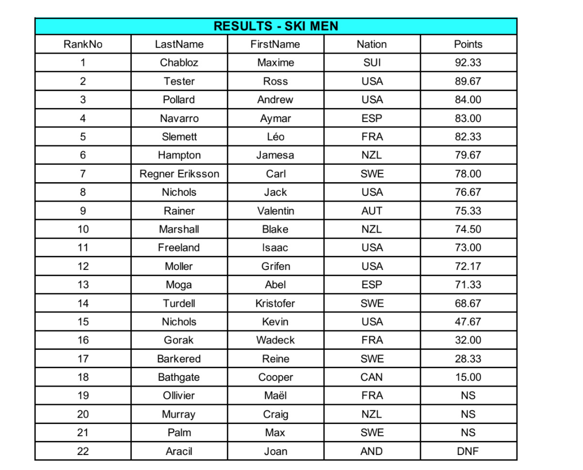 För att redigt fira av sista pyreneiska-klippan gick Turdell för en backflip, men hakade upp i landningen efter att ha hamnat i baksätet och först så roterade han till en hockeybroms, men karln stod på fötterna och kunde vrida ner skidorna i fallinjen igen och störtloppa sig ner i mål och hamna på en 14:e plats.