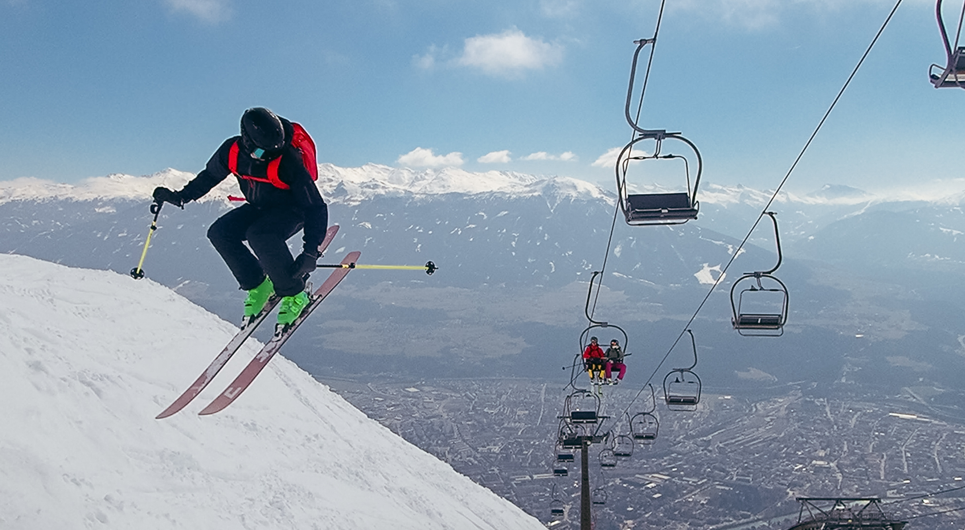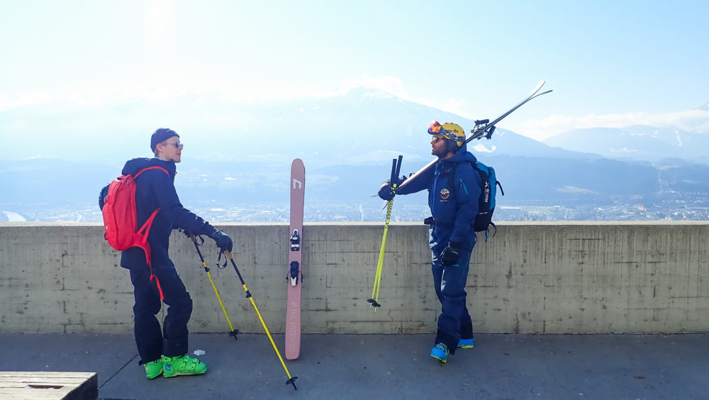 Under den skraltiga tvåstolsliften som leder upp till gondolen ser vi hur en fotograf gör sig iordning att knäppa några bilder på en backflippandes local. Kicken ser fin ut och vi tänker oss något liknande för att fånga lite air-time med Innsbruck i bakgrunden. Tanken är kanske bättre en resultatet.