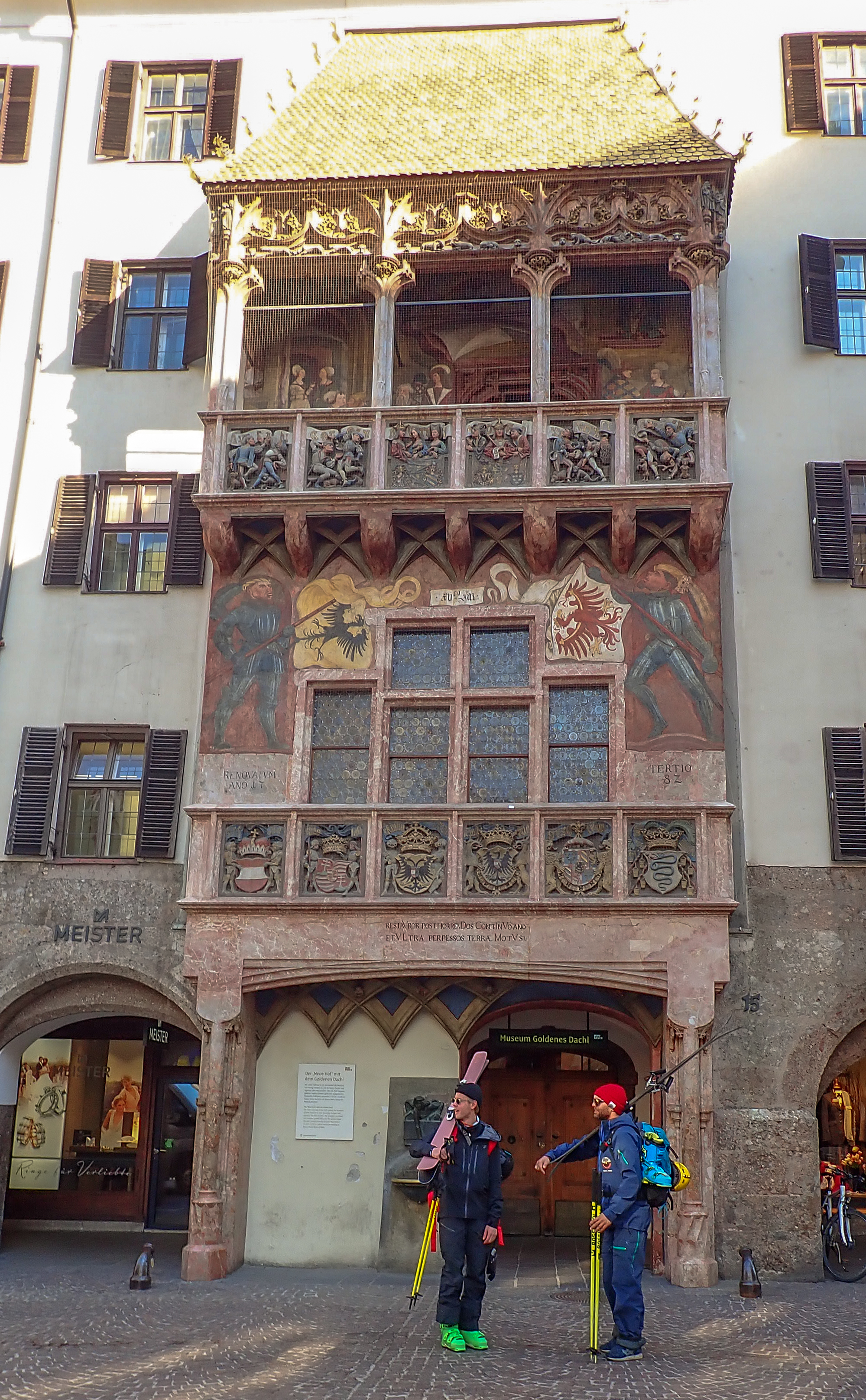 Dag nummer två möter vi upp Christian under det gyllene taket i gamla staden. En symbol för Innsbruck och vi lyckas få till en bild på Christian och jag när vi står och planerar dagens åkning uppe på Nordkette. Mitt i centrum, utanför kongressbyggnaden tar man det lilla tåget upp till gondolen. Hoppar av tåget och vidare in i gondolen och några minuter senare är man på toppen av Nordkette.