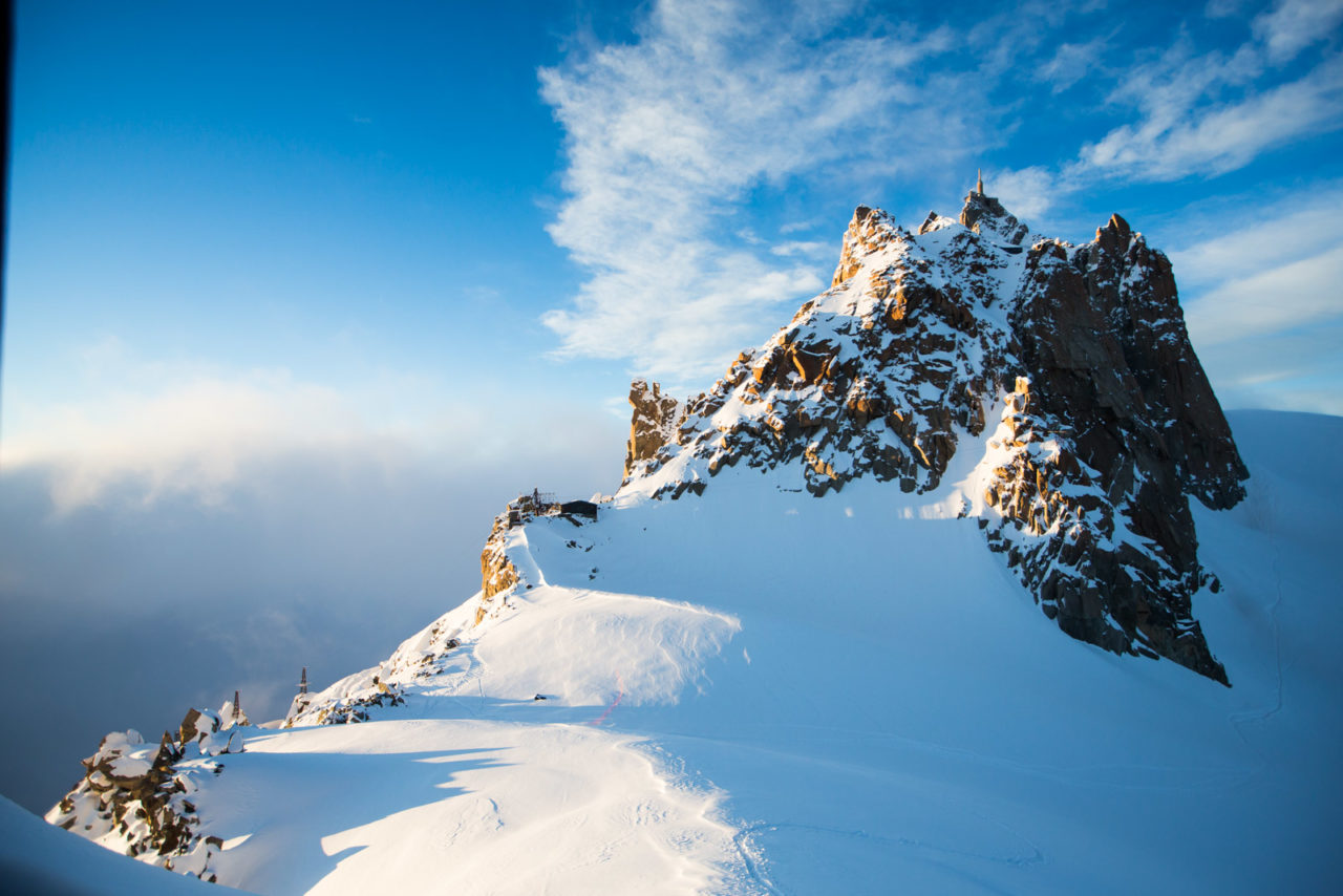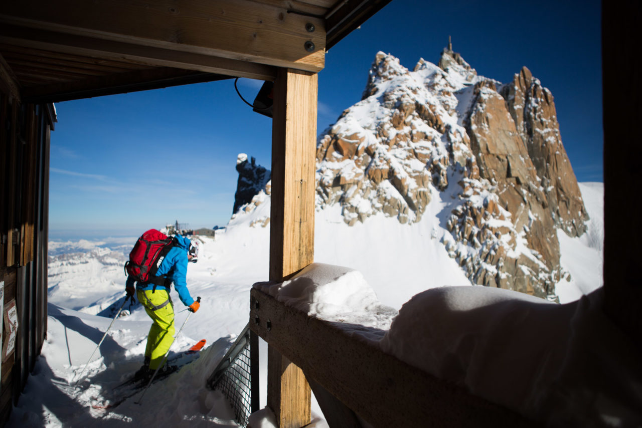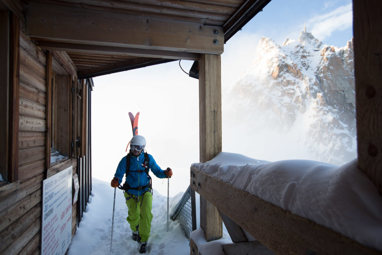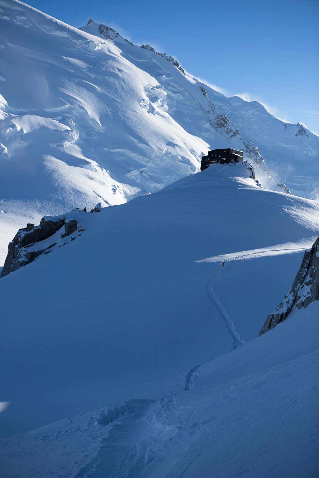 Från toppstationen på Aiguille du Midi gå den vanliga kammen ner tills det är dags att sätta på sig skidorna. Håll sedan höger runt berget hela vägen tills det på slutet blir ett motlut att ta sig uppför. Här ser du hyttan snett upp till vänster.