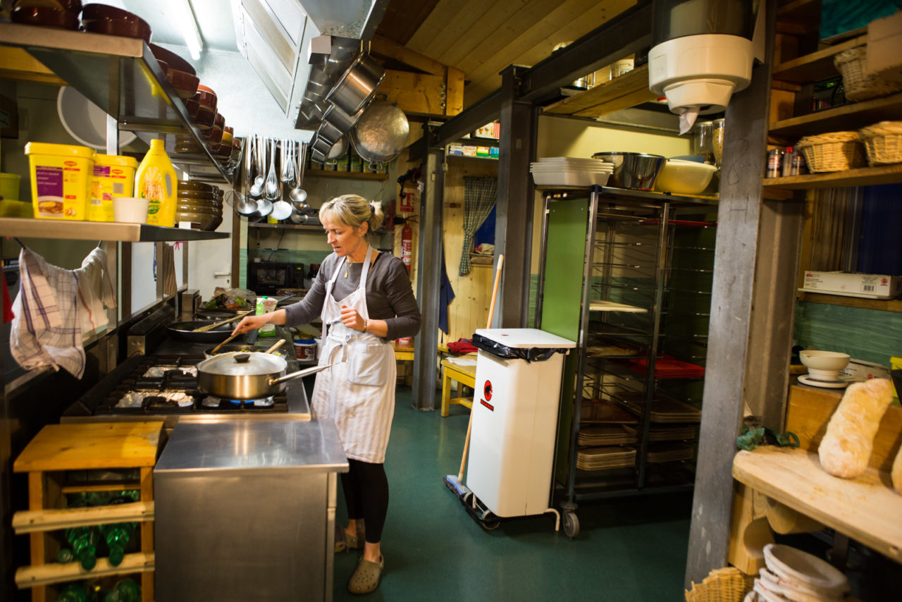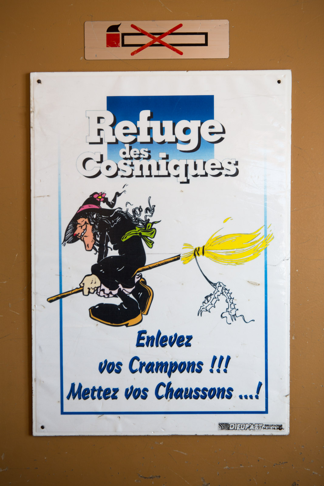 Cosmiqueshyttan eller Refuge Des Cosmiques som den heter på franska är en av de fyra vanligaste startplatserna. De andra är hyttan från Les Houches-sidan, hyttan Grand Mulets som nås från mittstationen och bestigning från den italienska sidan. När vi är här har hyttan nyligen öppnat för säsongen och tillsammans med två fransmän är vi de enda gästerna. Ingen med avsikt att bestiga Mt Blanc. Högsäsongen är på sommaren då hyttan med sina hundrafemtio bäddar ofta är fullbelagd med alpinister, guider och turister med målsättningen att bestiga Mt. Blanc. I köket står Laurence Ravanel bland kastruller och stekpannor och lagar vår trerättersmiddag som ingår i övernattningen. Ja, vi är i Frankrike, något enklare skulle de franska alpinisterna aldrig acceptera, även om vi befinner oss på 3613 meter. Efter att ha serverat oss soppa som förrätt, följt av en mustig köttgryta och krämig brylé i efterrätt sätter hon sig ner vid vårt bord. Laurence har varit ansvarig för driften av hyttan sedan början på nittiotalet och hon vet hur viktig maten är för att man ska orka med en dag i bergen. Laurence är uppvuxen i Chamonix med en familj som spenderat sina liv i bergen. Fadern, farfar och morbrodern var alla bergsguider.