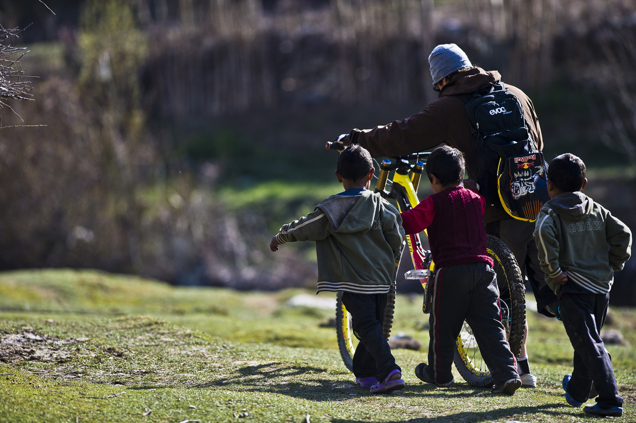 ![]() Darren får sällskap av några nyfikna barn i Nepal Foto: John Wellburn/Red Bull Content Pool |