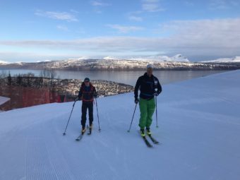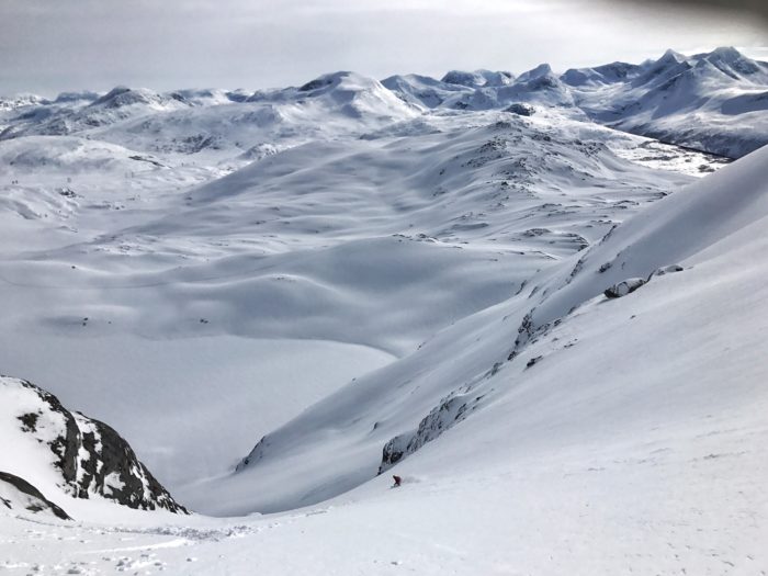 Beisfjord tornar upp sig som en massiv jätte längre in i dalen. Dags för dagens tredje uppförstur, tillika svettattack. Stighudar på. När vi når toppen ser vi långt, men ändå inte nog långt för att se Riksgränsen. Åket ner mot Isvatnet ligger likt en autobahn och bara väntar på oss. Några selfies senare hör man Robin Anderssons glädjetjut när han svänger ner i den fina pudersnön. Snön är inte djup, men med våra små korta turskidor känns det som djupaste Japanpudret.