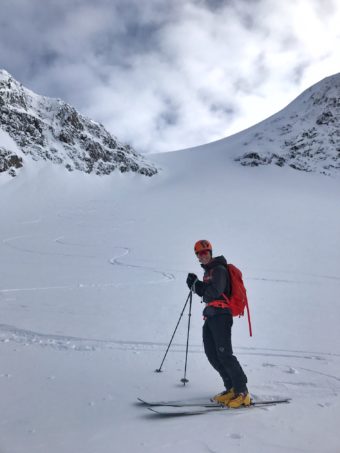 Vi är snabbt på med stighudarna igen. Tjugo minuter senare står vi vid dagens andra åk. Utgången på åket är svår att finna då det är hängdrivor på kanten. Till slut ser vi hela vägen ner till Isvattnet och vet att vi är rätt. Det är ett storslaget åk med silhuetten av berget Rombakstötta rakt fram. Solen lyser ner i fjorden och en känsla av frihet sprider sig i hela kroppen. Vi är verkligen på upptäcktsfärd. Åket är ihållande brant och är här nedanför drivorna lättnavigerat.