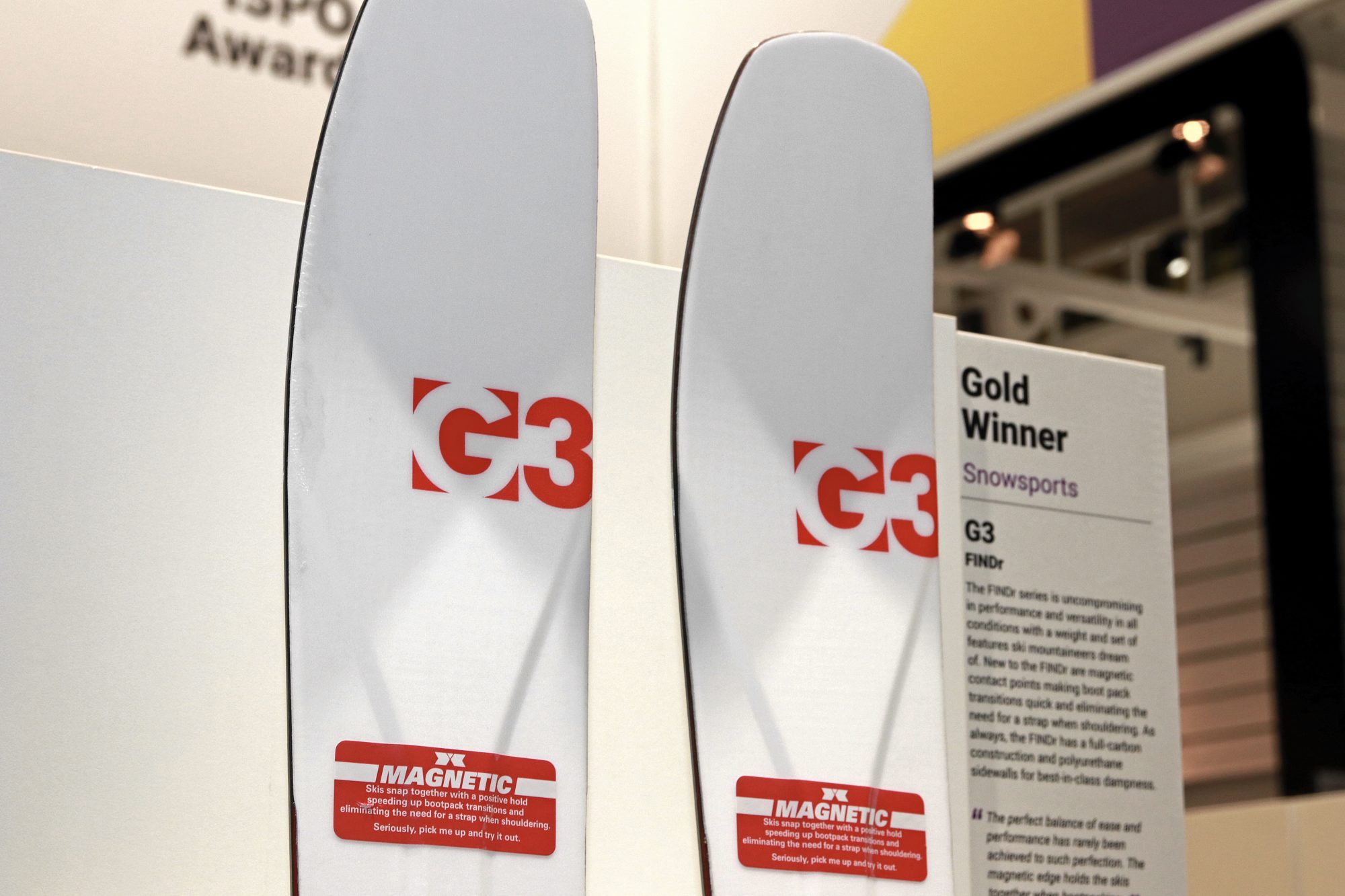 G3:s skida FINDr är en dröm för alla toppturare vad gäller vikt och prestanda. Nytt med FINDr är de magnetiska kontaktpunkterna som gör att skidorna smakar ihop, belag mot belag, med ett snäpp. Enklare när du behöver sätta de på ryggsäcken och bootpacka, eller ska gå till billen, bussen eller vad helst annat fordon. Juryns motivering: