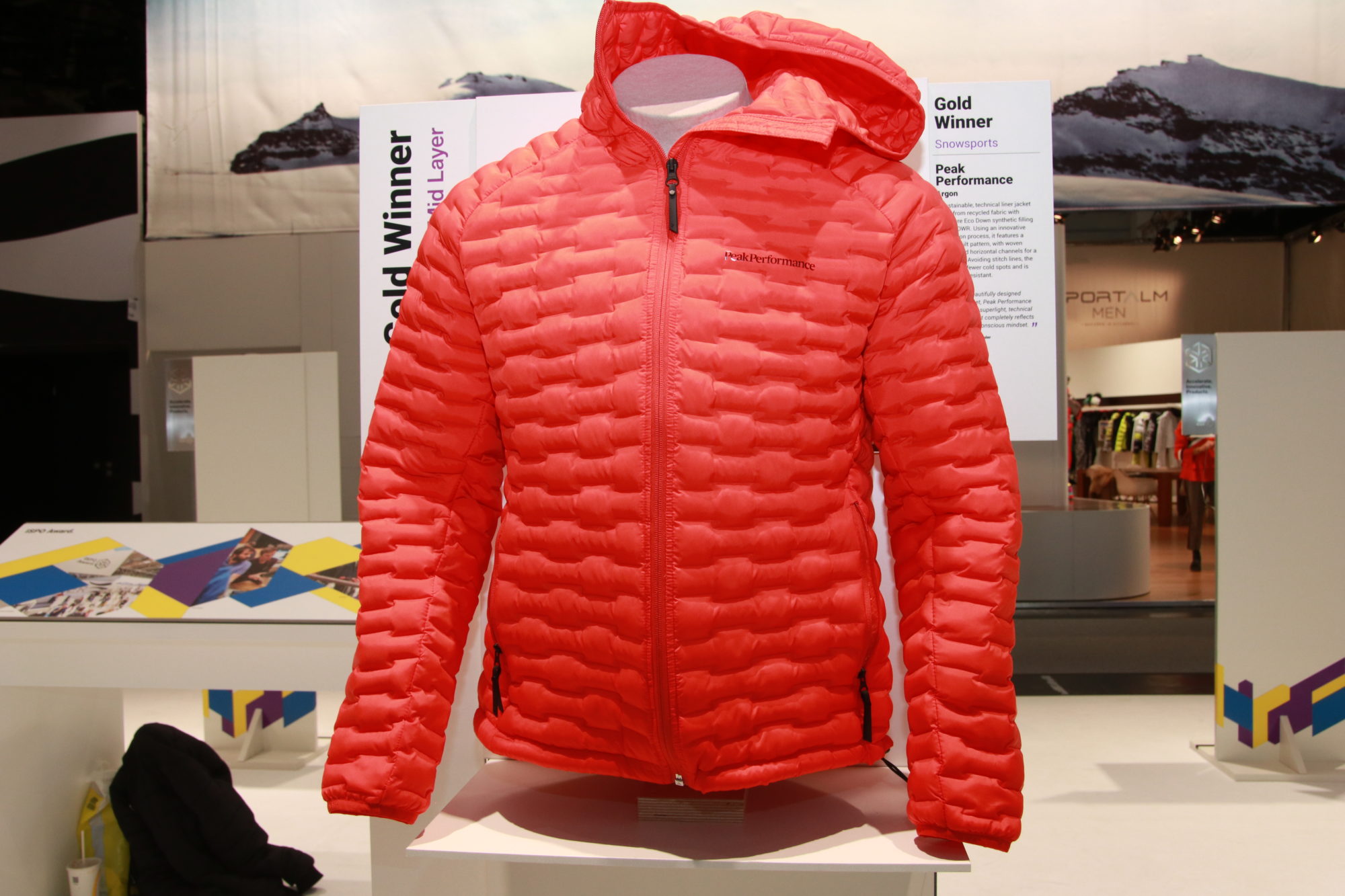 ”Med den vackert designade Argon-jackan introducerar Peak Performance en superlätt, teknisk isolering (Thermo Eco Down synthetic filling) som reflekterar dages miljömedvetna tankesätt.”