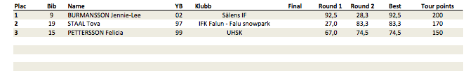 I tjeklassen utmanades Jennie-Lee Burmansson ordentligt av Tova Ståål och Felicia Pettersson men Burmansson visade återigen bländande skidåkning. Med ett imponerande förstaåk i finalen höll hon undan för utmanarna och stod återigen överst på pallen.