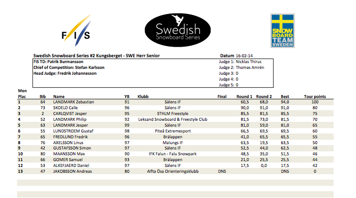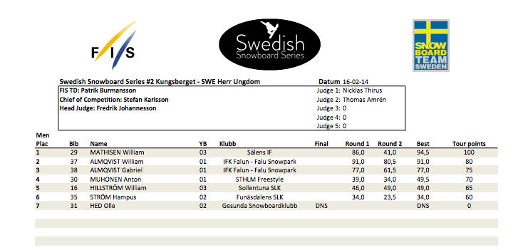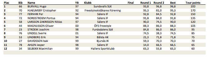 Freeskitävlingen (SST) hölls under lördagen och det kom att bli en rafflande strid om topplaceingarna i herrarnas final. Christopher Hjälmeby ledde med mager marginal framför Per Fernvik inför sista åket. Men när ingen av dom lyckades förbättra sig i andra omgången såg Hugo Burvall sin chans och som sista åkare ut slog han till med dagens absolut bästa åk. Med en poäng på 96,8 säkrade Hugo segern och tog i och med detta även över ledningen i touren.