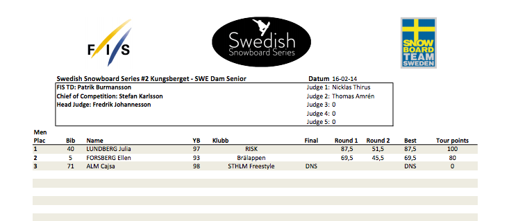 Julia Lundberg stod för dagens show när hon efter ett stabilt förstaåk i tjejseniorklassen satsade allt i sina övriga åk och gick för 720 i det största hoppet som hon sånär satte. I killarnas seniorfinal bjöds det på avancerade trick och Zebastian Landmark, som börjat dagen smygandes, ökade svårighetsgraden succesivt. Med sitt sista åk tog han hem segern framför förra tävlingens vinnare Calle Sköld.