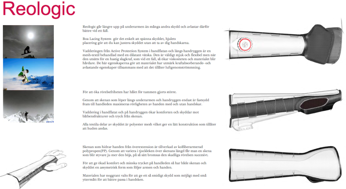 Reologic är resultatet av en designprocess där fokus legat på funktion, ergonomi och materialval. Genom designförbättring är förhoppningen att fler skall börja använda handledsskydd och fortsätta använda dem under hela sin aktiva tid.