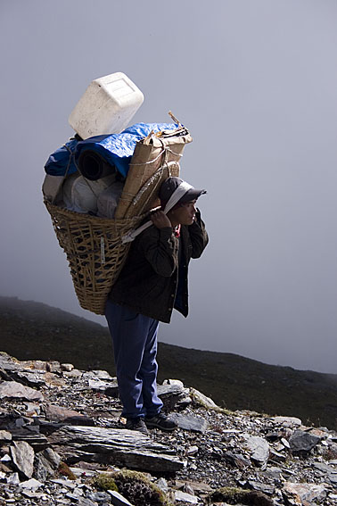 – Nu tar vi lunch, sa han. Vi satte oss ner och plockade fram vår medtagna lunch som bestod av Chapatti, ett kokt ägg, ett kexpaket och en chokladkaka. Medan vi började äta av lunchen pekade Budhi på toppen som låg åtminstone 500 höjdmeter högre upp och sa ”Där är lägret!”. Som tur var gick vi inte hela vägen till toppen utan hittade en fin tältplats ungefär halvvägs. Det var jag rätt nöjd med. Budhis bror Kansha som bar på en stor flätad korg full med köksutrustning var också rätt nöjd att det var slutet på dagen.