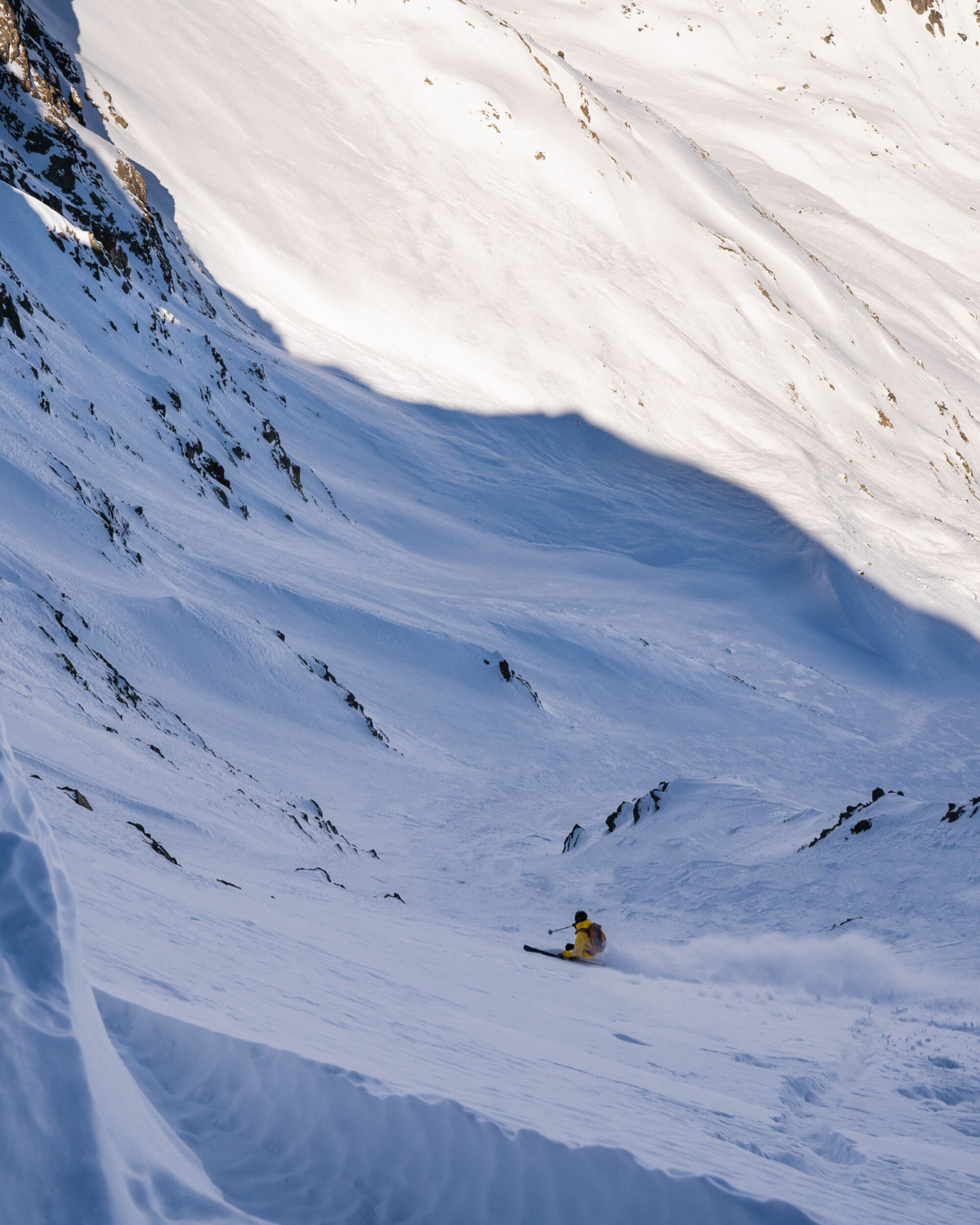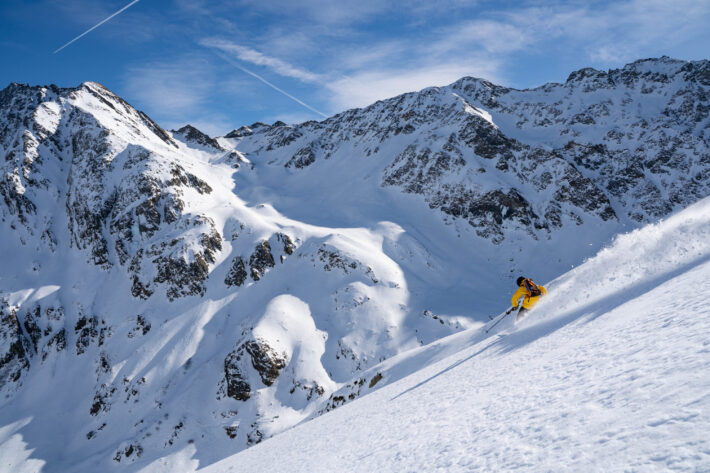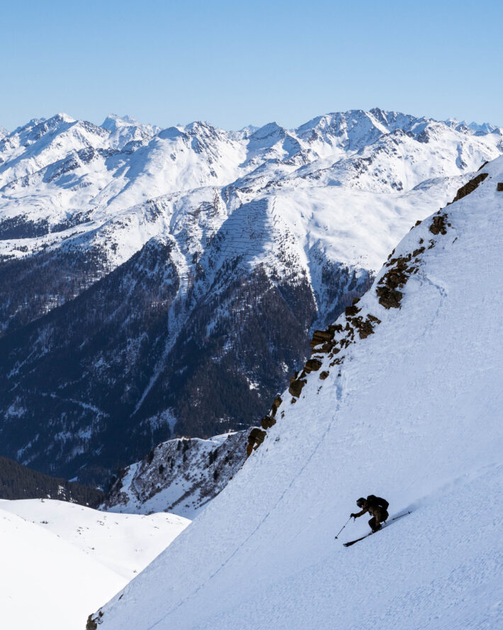 Men mitten-dalen, Malfontal, aperitifen. En dalgång helt utan mobiltäckning, ingen lift och ingen civilisation i sikte. Det finns ett enkelt insteg från Hinter Rendl så kommer man in halvvägs in i dalgången men för att komma in från kronan av dalen anbefaller vi att ta den mysiga tvåstolaren Rifflebahn I, skråa en bit skier left, över två krön, sikta uppåt mot Kreuzjochspitze och knata de 400 höjdmeter som krävs för att nå sadeln. Äntligen får du lite brantåkning framför skidspetsarna, nordsida och kallsnö som ligger där helt orörd. Du droppar ner och känner hur krafterna för att hålla nere farten är större än vanligt. Snön du river upp stannar inte och du hör sluffet som jagar dig i nacken. Snabbare eller vika av är alternativen. Du kör snabbare . Svängarna länkar ihop sig, du är helt ensam i hela världen. Så känns det i alla fall, flow, medan du tävlar mot din egen upprivna snö. En bit ner tar du en sväng åt sidan för att stanna på ett lavinsäkrare ställe med utsikt över hela Malfontal, din lekplats för dagen!