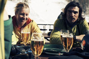 Efter ännu en lång dags skidåkning sitter det fint med en kall öl på Baita del Soles uteservering i backen.