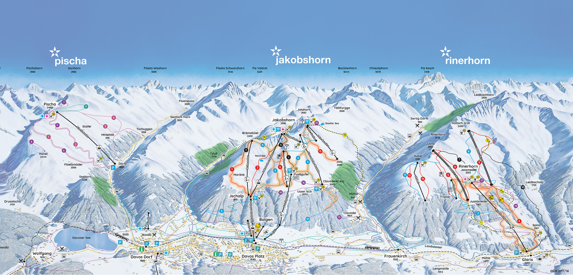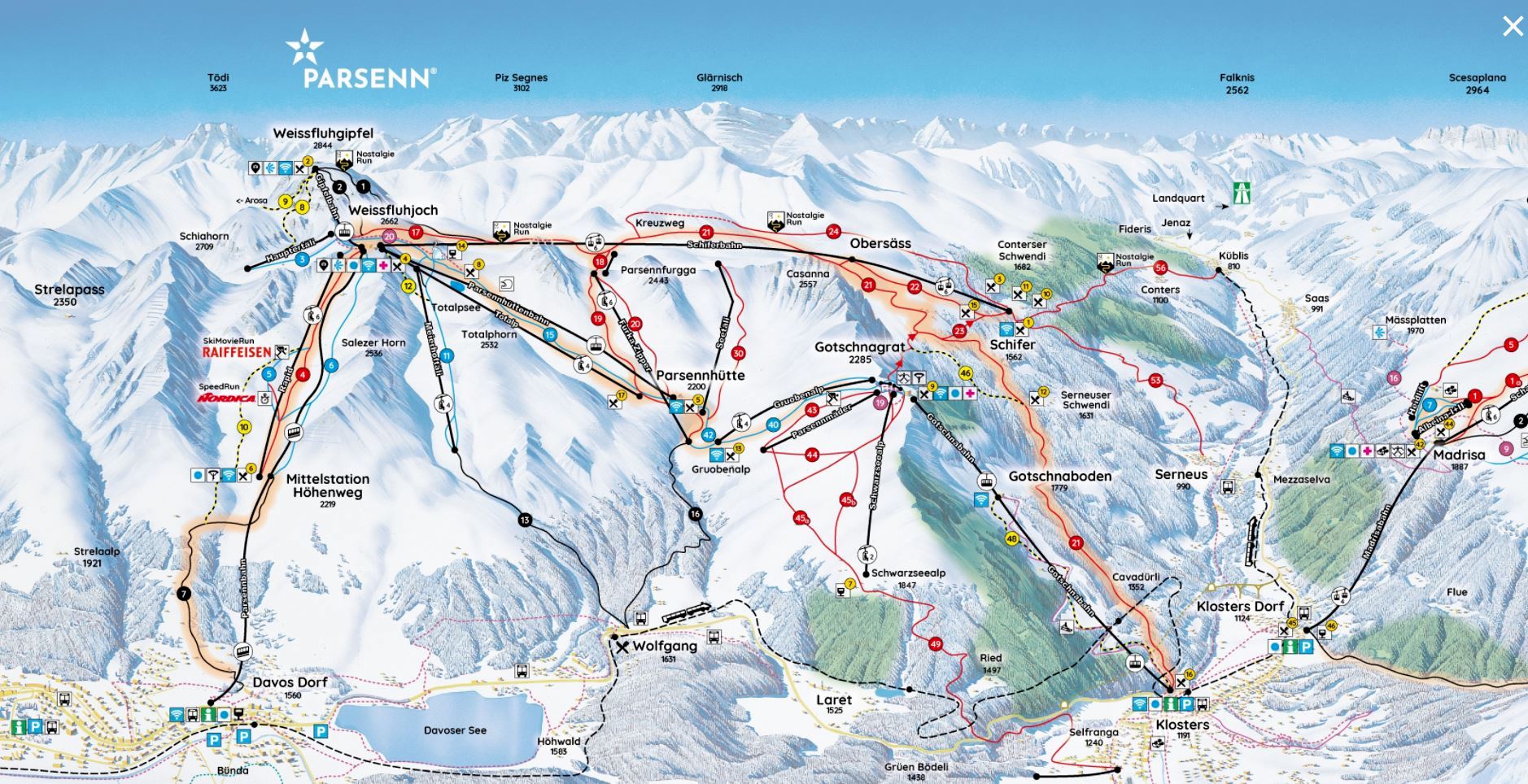 Förutom alla lyxhotell och exklusiva brand shops, så har Davos även det mesta inom vintersport. Man tävlar här i världscupen både i längdskidåkning och i bobsleigh. Och här finns förstås massor av möjligheter för alpin skidåkning. Davos bjuder inte på ett jättelikt liftsystem typ Ischgl/Samnaun eller Val d’Isere, utan skidåkningen är uppdelad på fem olika liftsystem längs dalen. Tillsammans bjuder dessa på 320 km pist, och vi bestämmer oss för det största och mest kända av dem, Davos-Parsenn med 95 km pist.