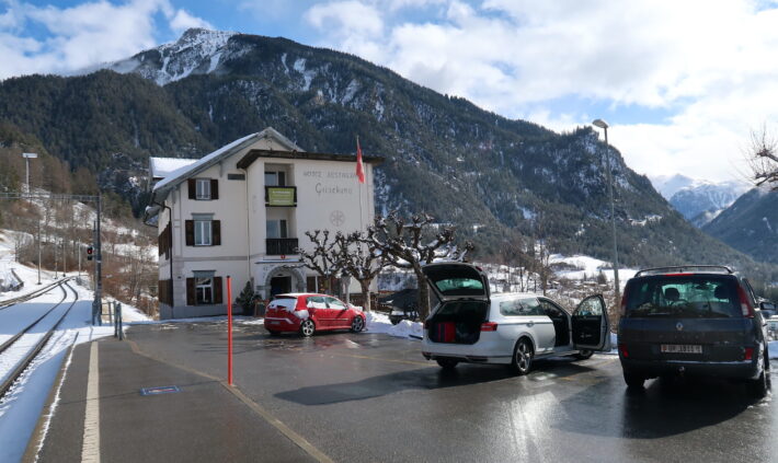 Vi åker skidor ner till dalstationen vid Rinerhornbahn, där man bara går rakt över vägen igen till tågstationen. Och här gäller det att inte glömma att vid tidtabellskylten trycka på ”knappen”. För glömmer man det så kör tåget bara förbi Glaris. Vi glömmer inte utan får en kort och behaglig transport tillbaka till vårt hotell i Filisur.