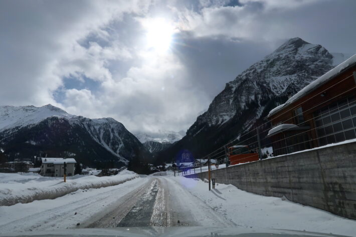 Davos är även känt för att vara ett ”Schneeloch” typ Arlberg, och under den dryga halvtimme det tar att köra hit från Filisur, så ser vi att snötäcket i dalen hela tiden blir tjockare och framme i Davos ligger det över en meter vid sidan av vägen. Vi kör in i vad som är en riktig stad med mycket trafik och människor överallt, en väldig kontrast till Bergün och Bivio.