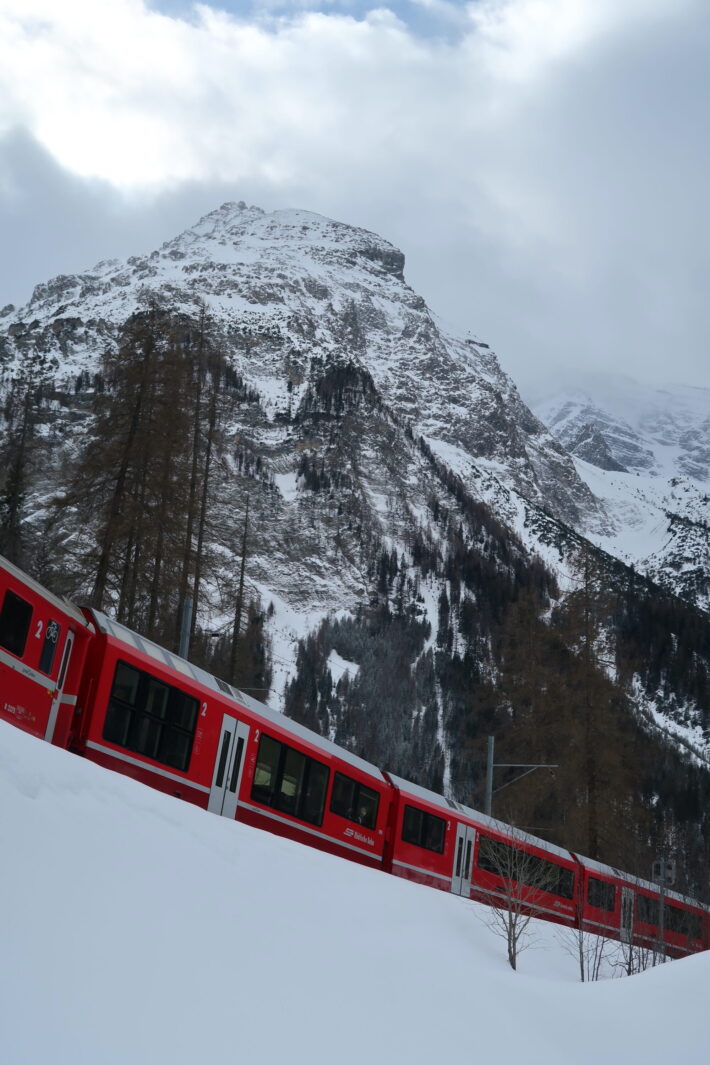 Längre ner blir pisten lite bredare igen och här råkar vi ut för en spännande sak. Från Filisur går Rhätische Bahn tåget till St. Moritz, och det går genom Bergün och sedan i slingor uppför sluttningarna mot Albulapasset och Albula tågtunneln. På väg ner kör vi under ett tågspår mitt i backen, och strax efteråt kommer tåget till St. Moritz farande förbi oss där vi står på skidor 10 meter vid sidan om spåret!