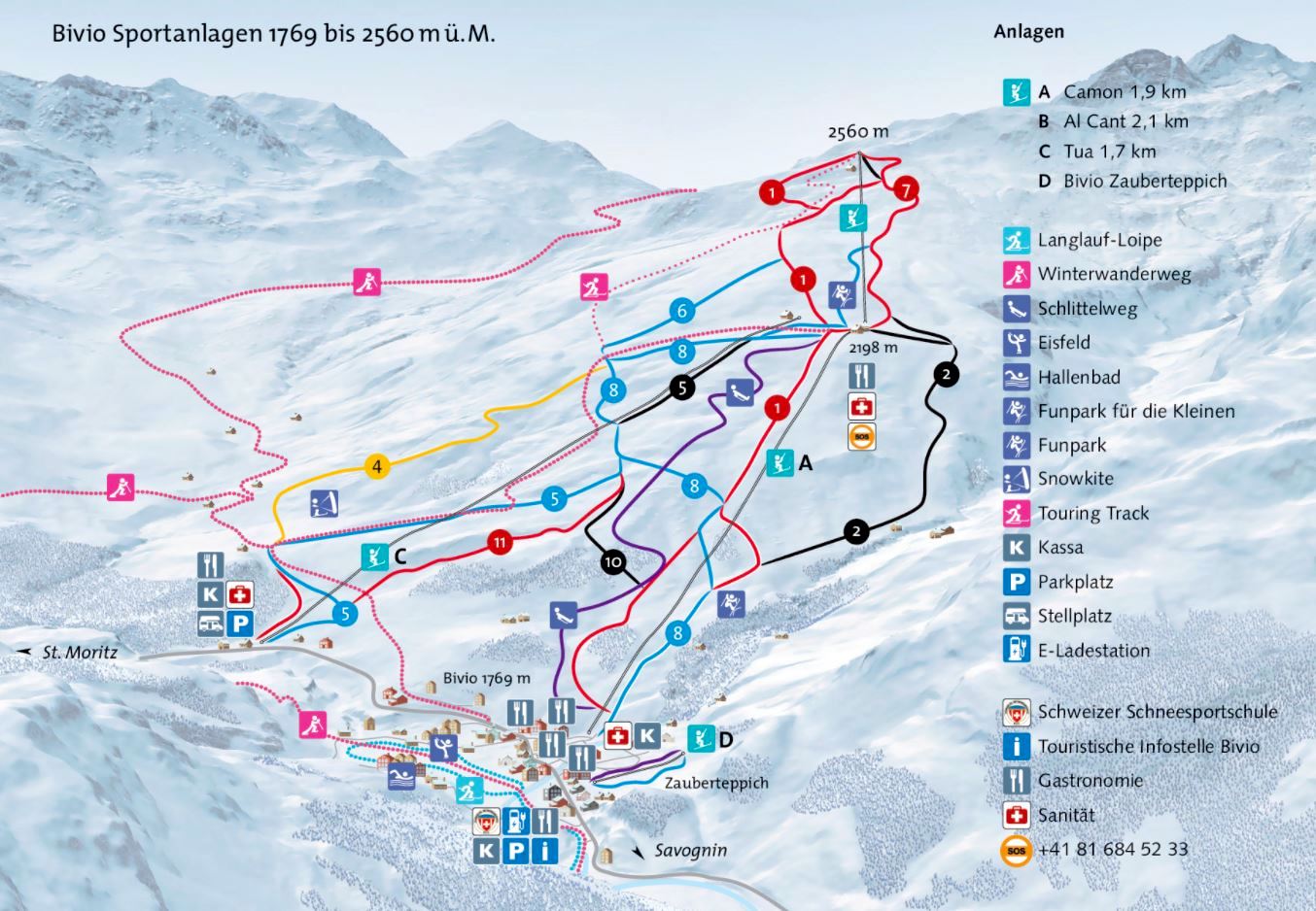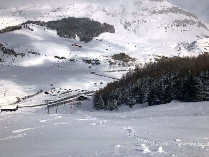 Den här dagen hittar vi helt klart den bästa skidåkningen i de nedre delarna där det ligger en hel del nytt puder (högre upp har det blåst bort), och skiers right från nedre delen av Schlepplift Tua hittar jag en liten transportväg som leder i riktning mot byn Bivio. Jag tar den bara ca 100 meter in mot liften innan jag svänger av neråt, och där hittar jag en skön sluttning med puder intill liften och ner mot dalstationen. Den fick jag ha för mig själv ett antal rundor innan några snowboardåkare också upptäckte den. Precis som de tidigare dagarna bjuder även Bivio på helt stressfri skidåkning utan någon som helst trängsel någonstans.